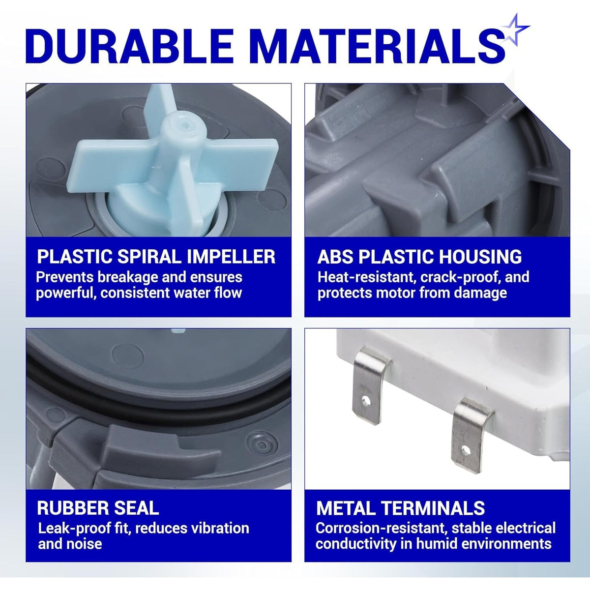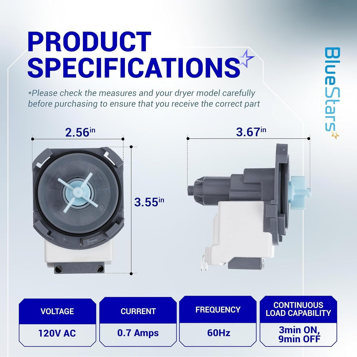 Constructed with premium ABS plastic housing and wear-resistant metal components, the BlueStars DD81-02635A Drain Pump is built to last. Its reliable rubber seal and spiral impeller design provide: