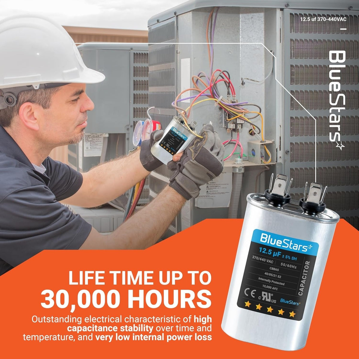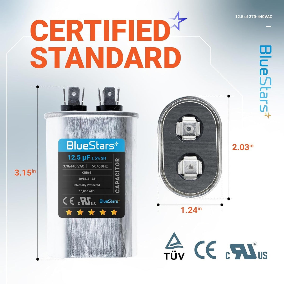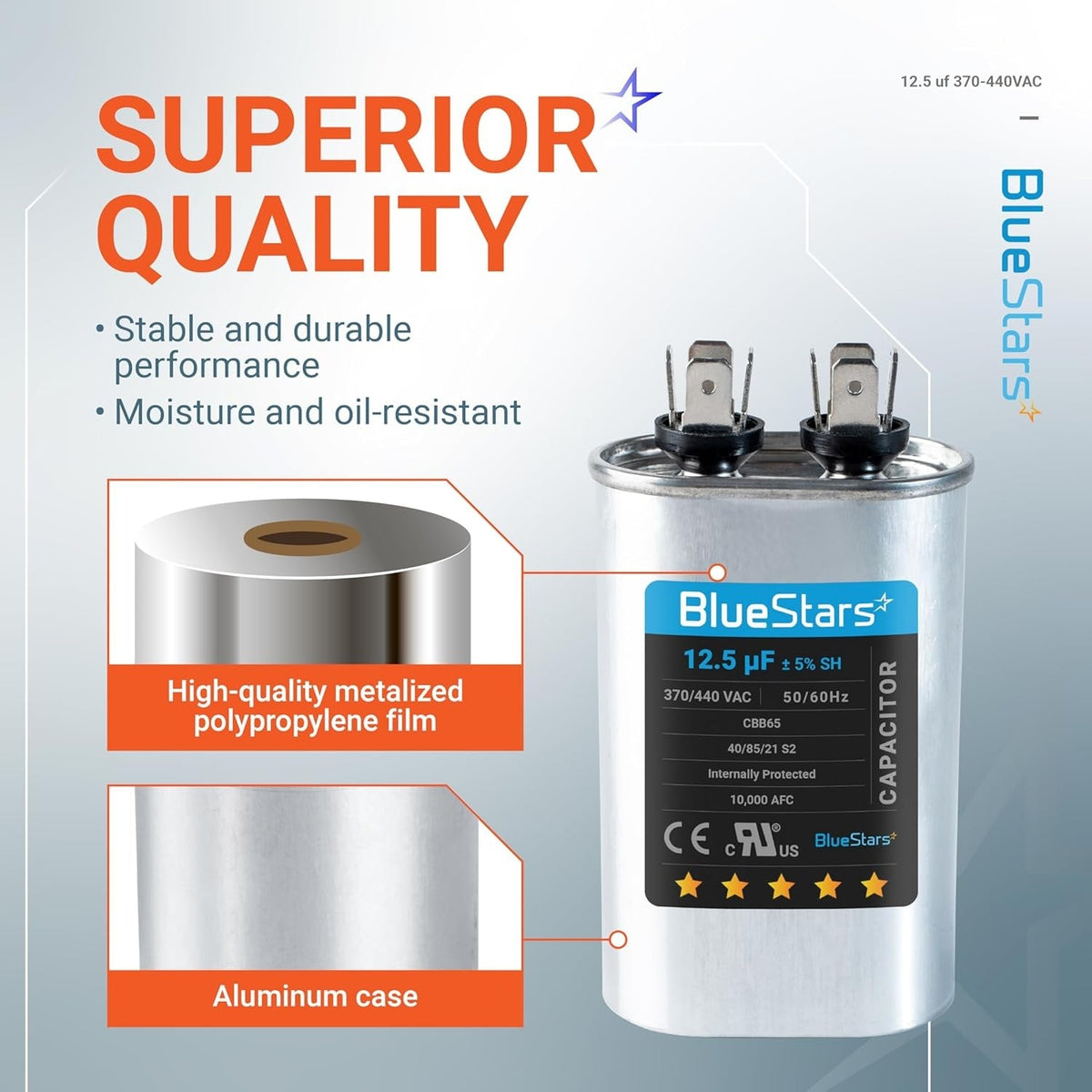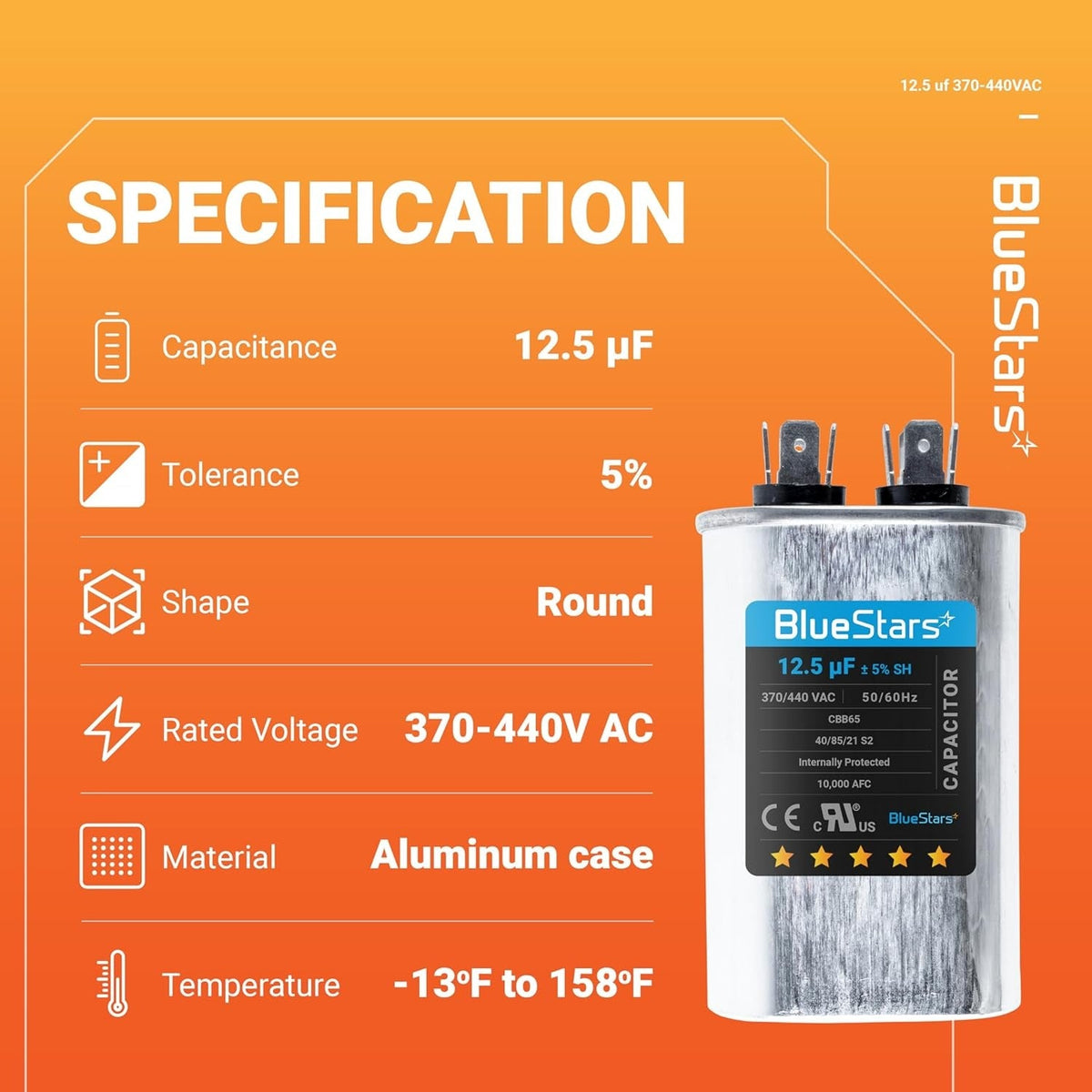 • Capacitance: 12.5 microfarads (µF) with a ±5% tolerance