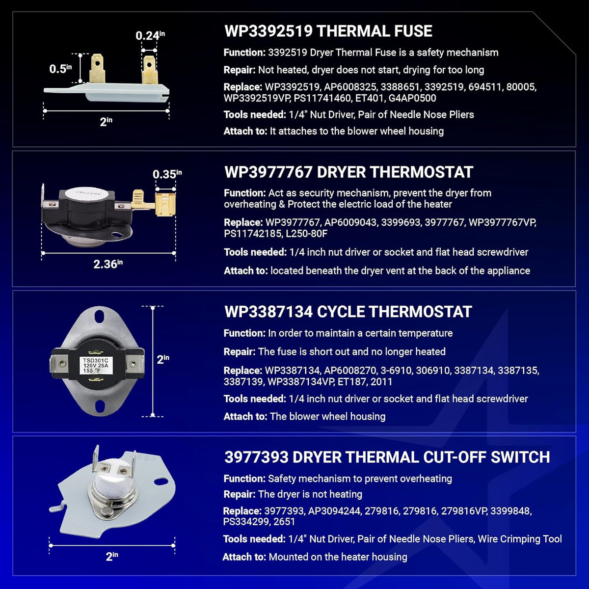 - Direct replacement for parts numbers: 2406026, 3403585, and W10724237