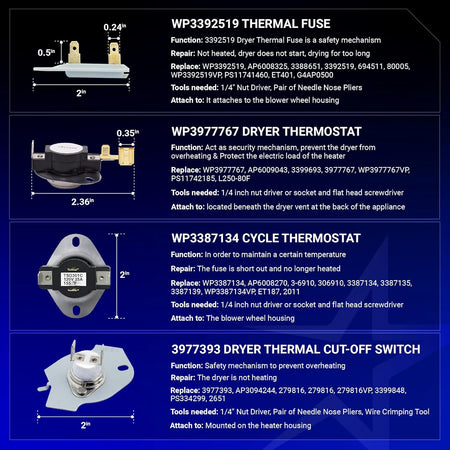 Upgrade your dryer with the 279838 Dryer Heating Element Full Repair Kit, designed for seamless compatibility with popular brands such as Whirlpool, Kenmore, Maytag, Amana, and Roper. This comprehensive kit includes all necessary components to effectively replace the heating element in your dryer.