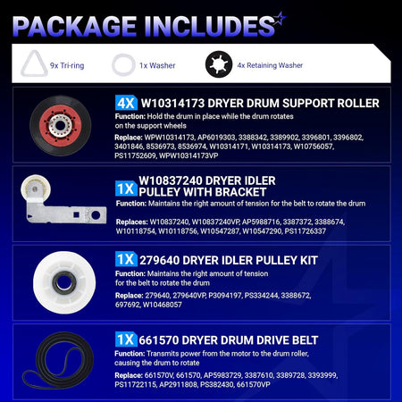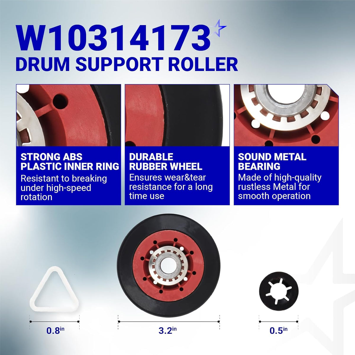 - WPW10314173 Drum Roller (or equivalent): A durable drum roller assembly to support the dryer drum and facilitate its rotation. Replacing a worn or damaged roller will eliminate excessive noise and ensure proper drum movement.