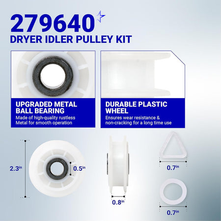 - 279640 Idler Pulley (or equivalent): This is a secondary idler pulley, potentially included to provide redundancy or for replacement purposes if the primary W10837240 pulley is determined to be beyond repair. The inclusion of a second ensures a comprehensive repair.