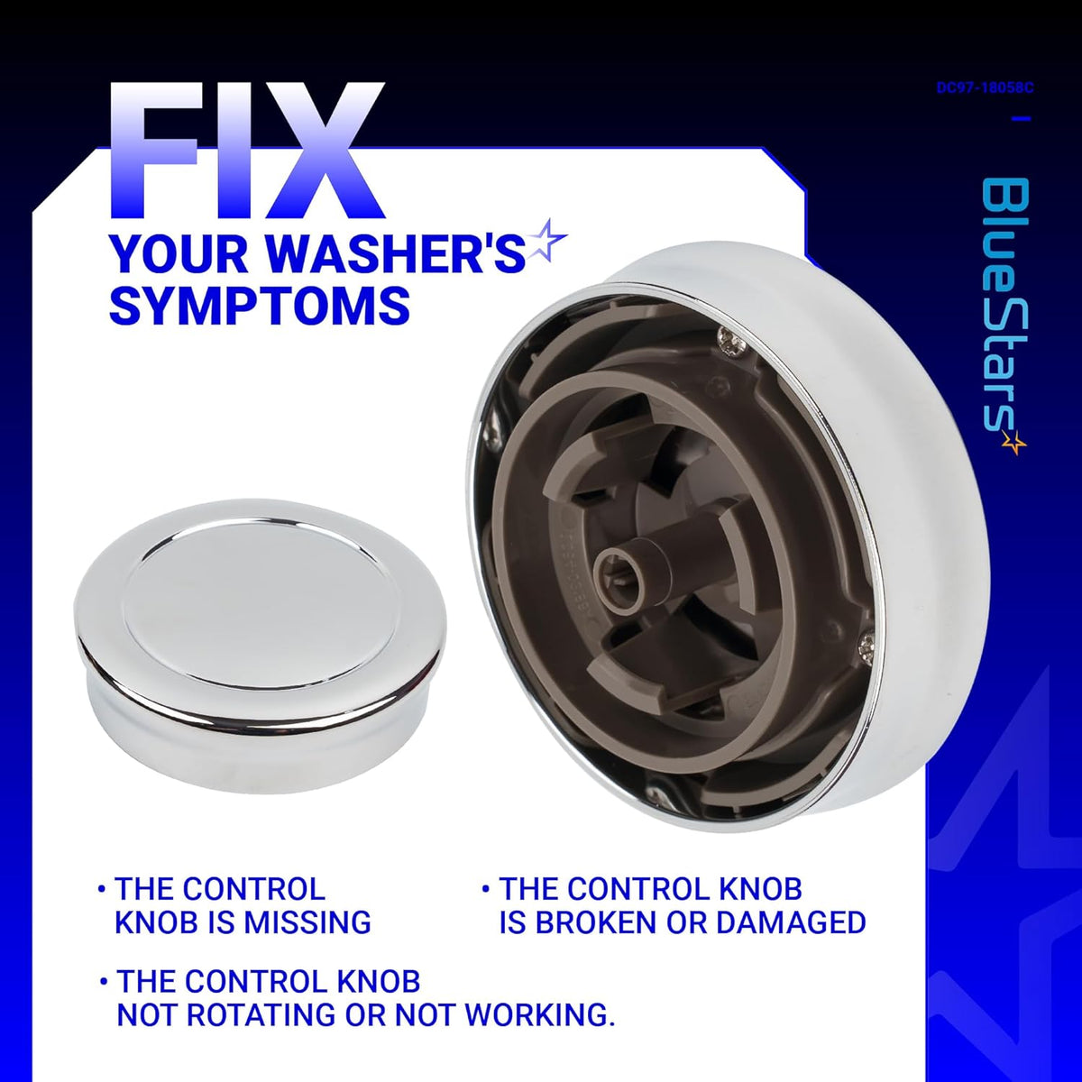 This listing is for a 2024 upgraded control knob assembly, part number DC97-18058C, designed for compatibility with a wide range of Samsung washing machines and dryers.