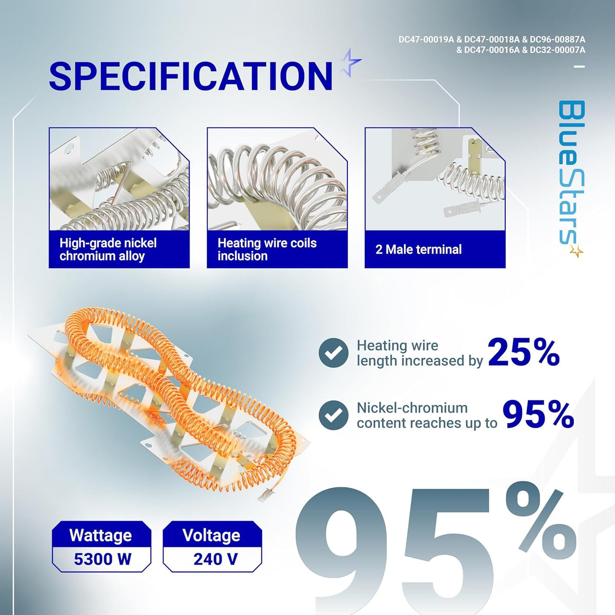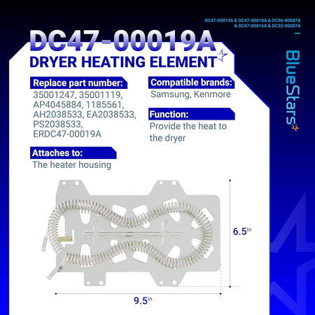 Our upgraded DC47-00019A Dryer Heating Element is crafted from high-quality metal, featuring heating wire coils with 95% nickel-chromium content for optimal heat generation. Key benefits include: