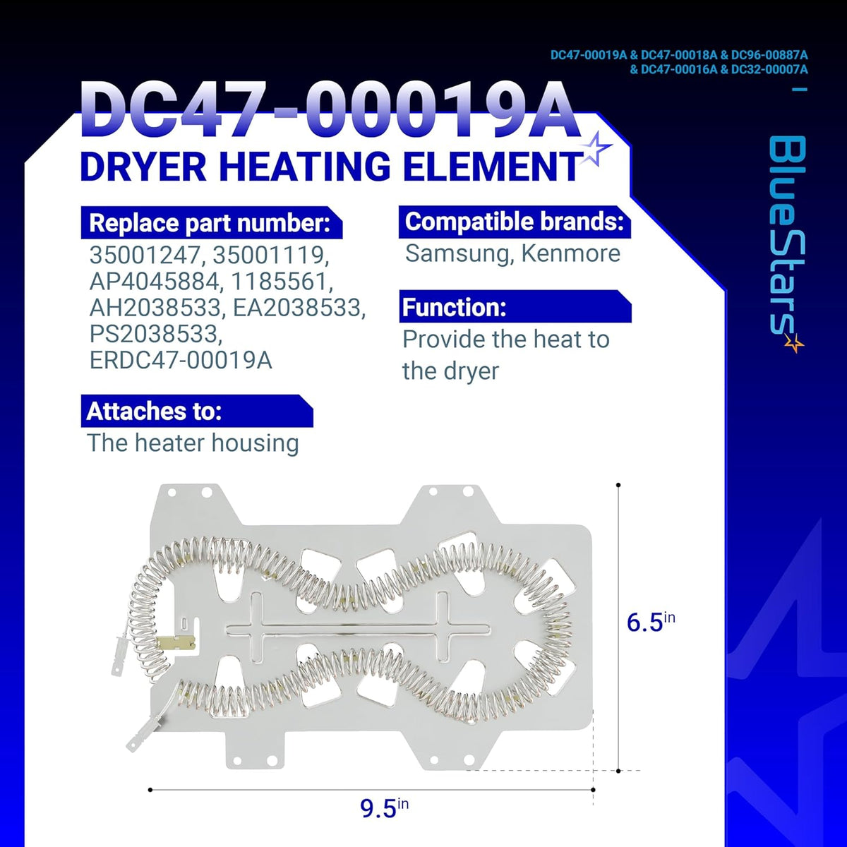 • DC47-00019A replaces: 35001247, 35001119, AP4045884, 1185561, AH2038533, EA2038533, PS2038533, ERDC47-00019A