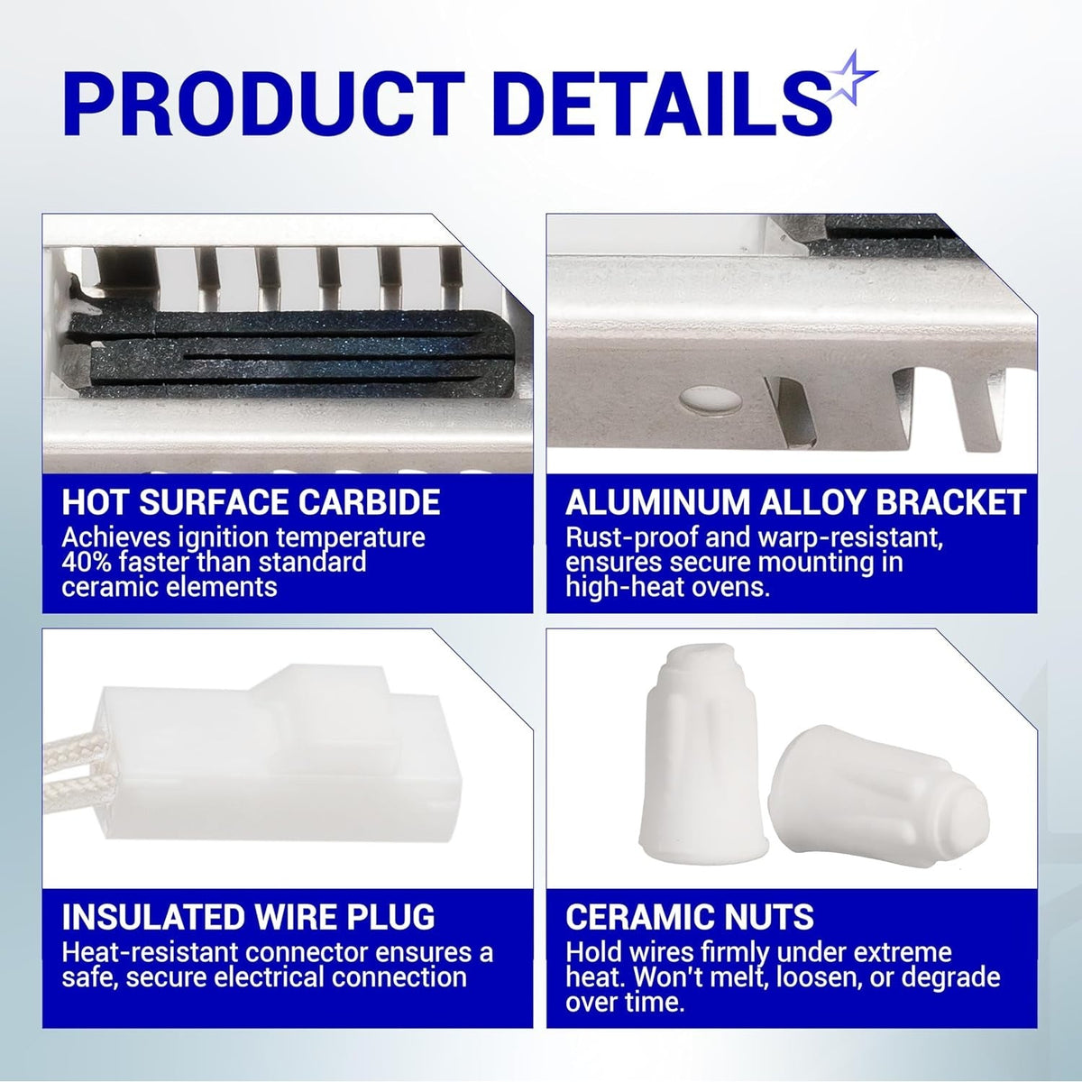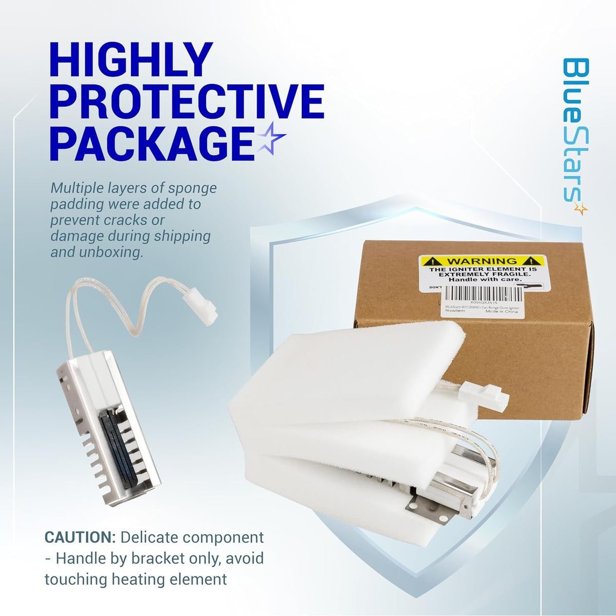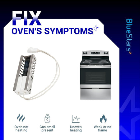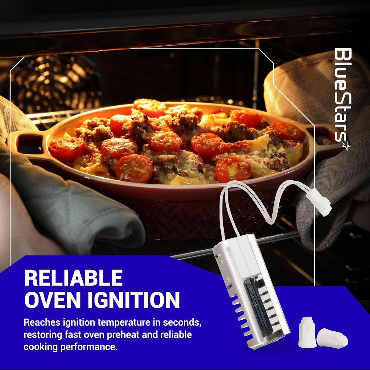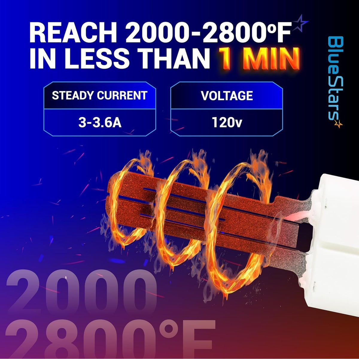 The BlueStars W11208965 Gas Range Oven Igniter heats to 2800°F in just 60 seconds, drawing precise electrical current to activate the gas safety valve for reliable flame ignition. It effectively resolves common issues such as: