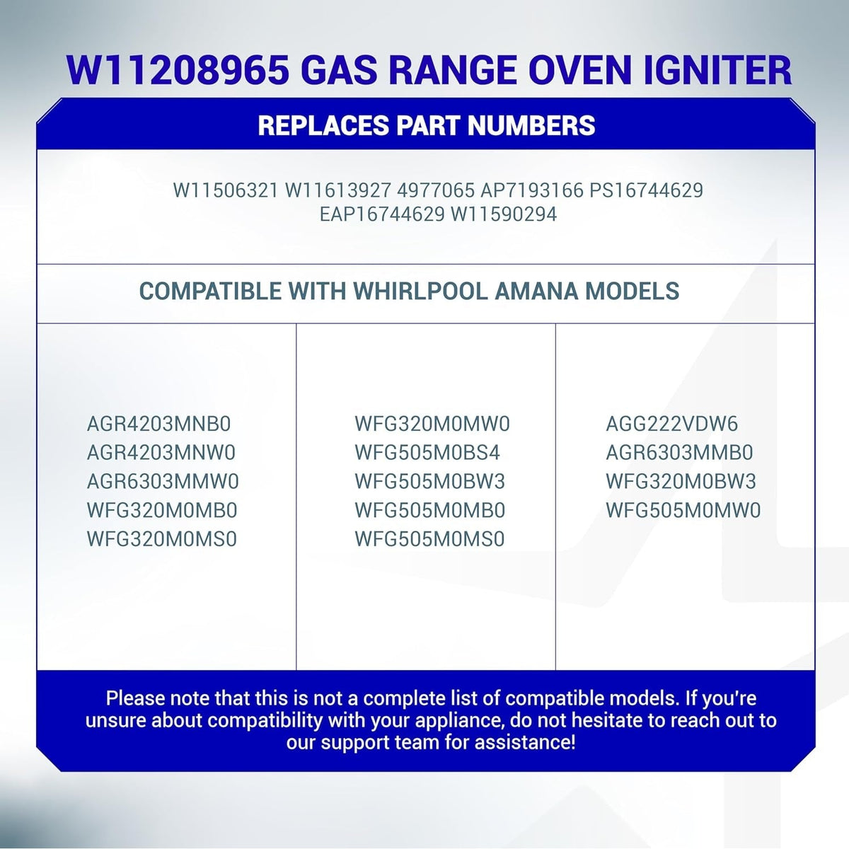 This igniter replaces part numbers: W11506321, W11613927, 4977065, AP7193166, PS16744629, EAP16744629, W11590294. It is compatible with various Amana and Whirlpool gas range stove oven models, including: