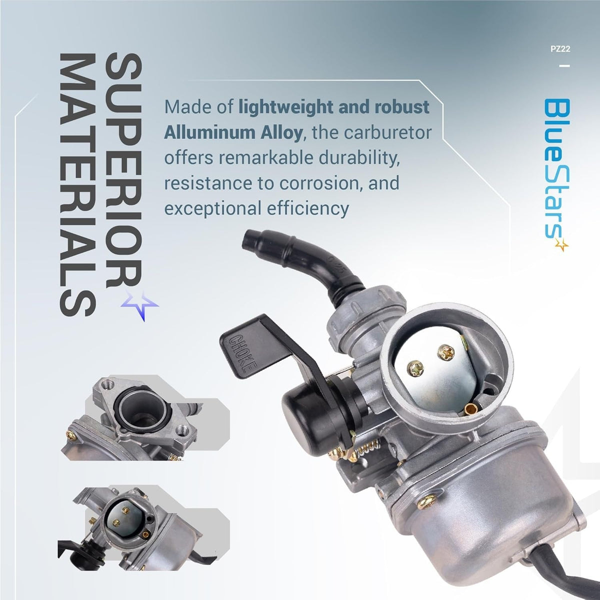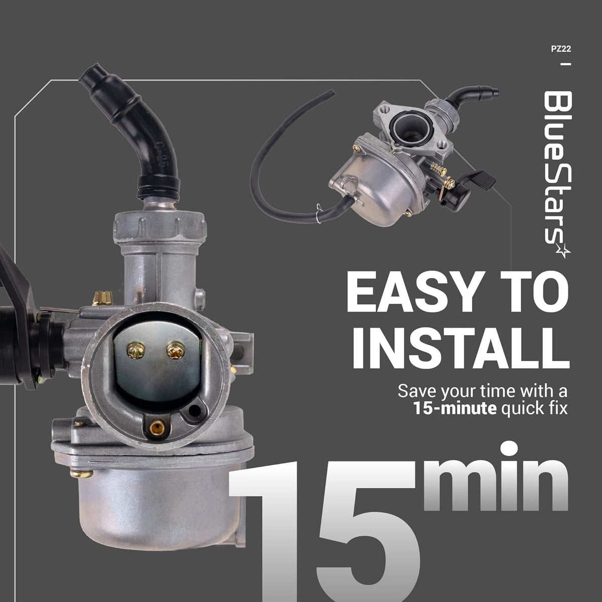- Kit typically includes: PZ22 carburetor, 38mm air filter, intake manifold, throttle cable, and hand grips.