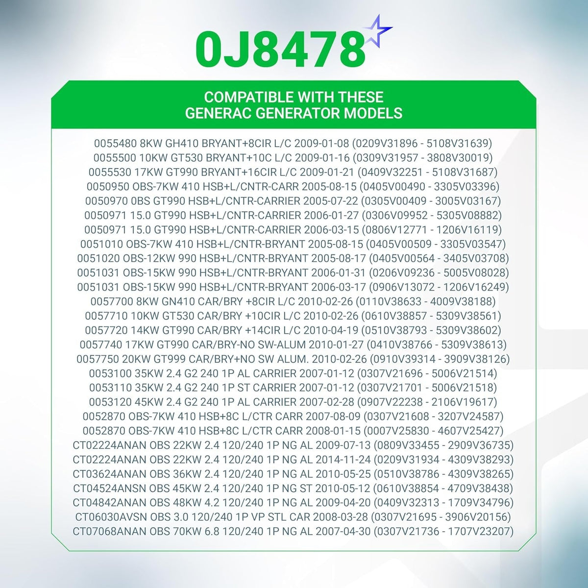• Generator Models: Fits most 14kW, 16kW, 18kW, 20kW, 22kW, 24kW, and 26kW air-cooled standby generators manufactured from 2013 to present.
