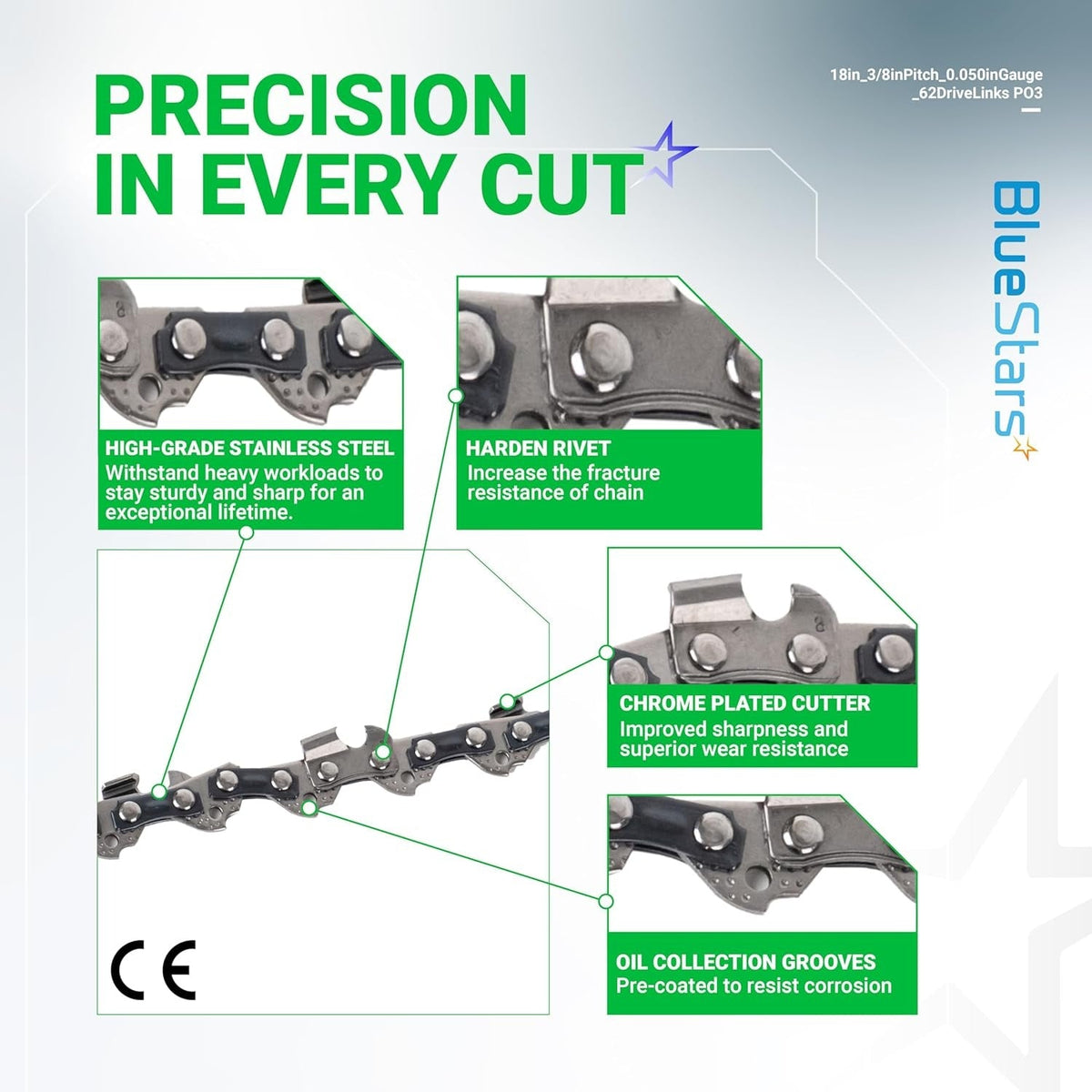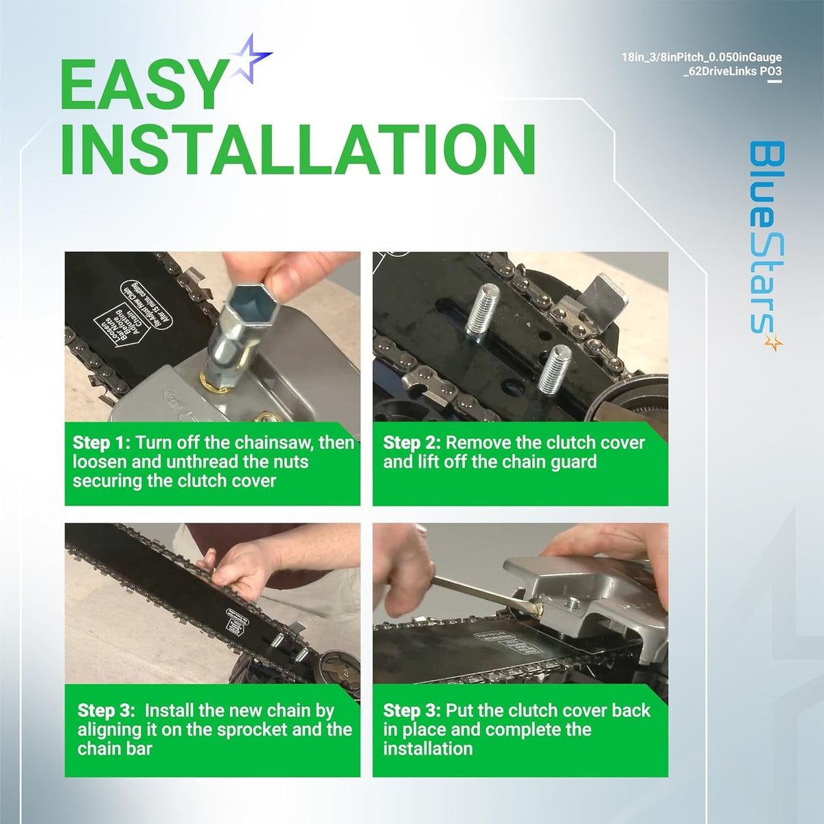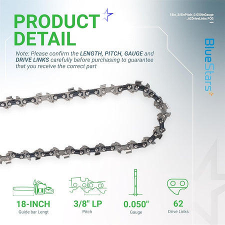Important: Always verify your saw's required specifications. Match the pitch (3/8" LP), gauge (0.050"), and drive link count (62) to the numbers stamped on your guide bar or listed in your owner's manual.
