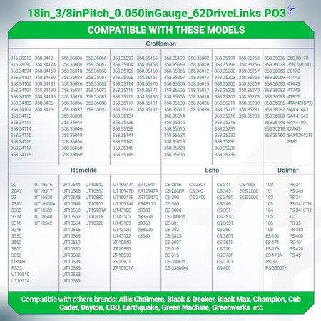 Fits select 18-inch chainsaws from brands including Craftsman, Echo, Homelite, Husqvarna, Poulan, Ryobi, and Stihl.