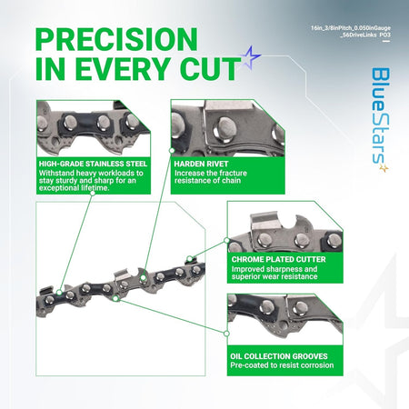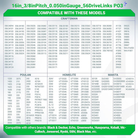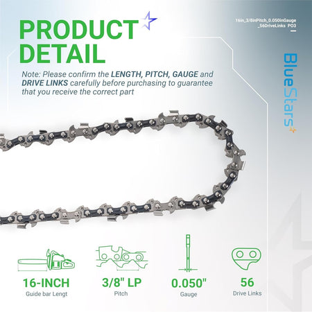 - Compatible with models requiring a 16-inch bar and a chain matching these specifications: 3/8" LP Pitch, 0.050" Gauge, and 56 Drive Links.