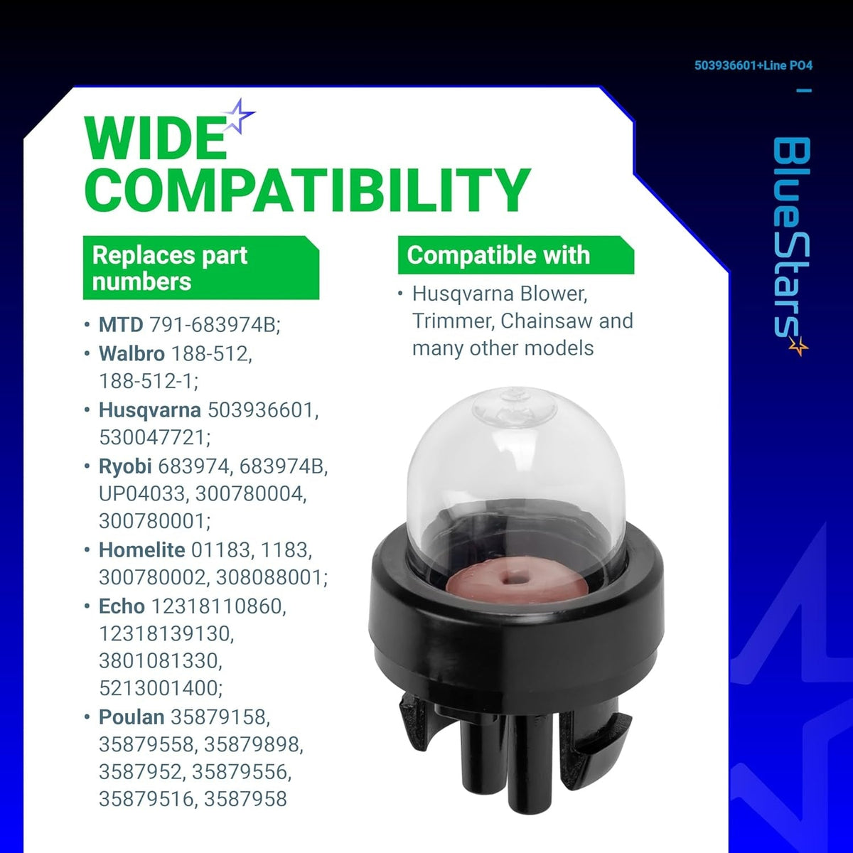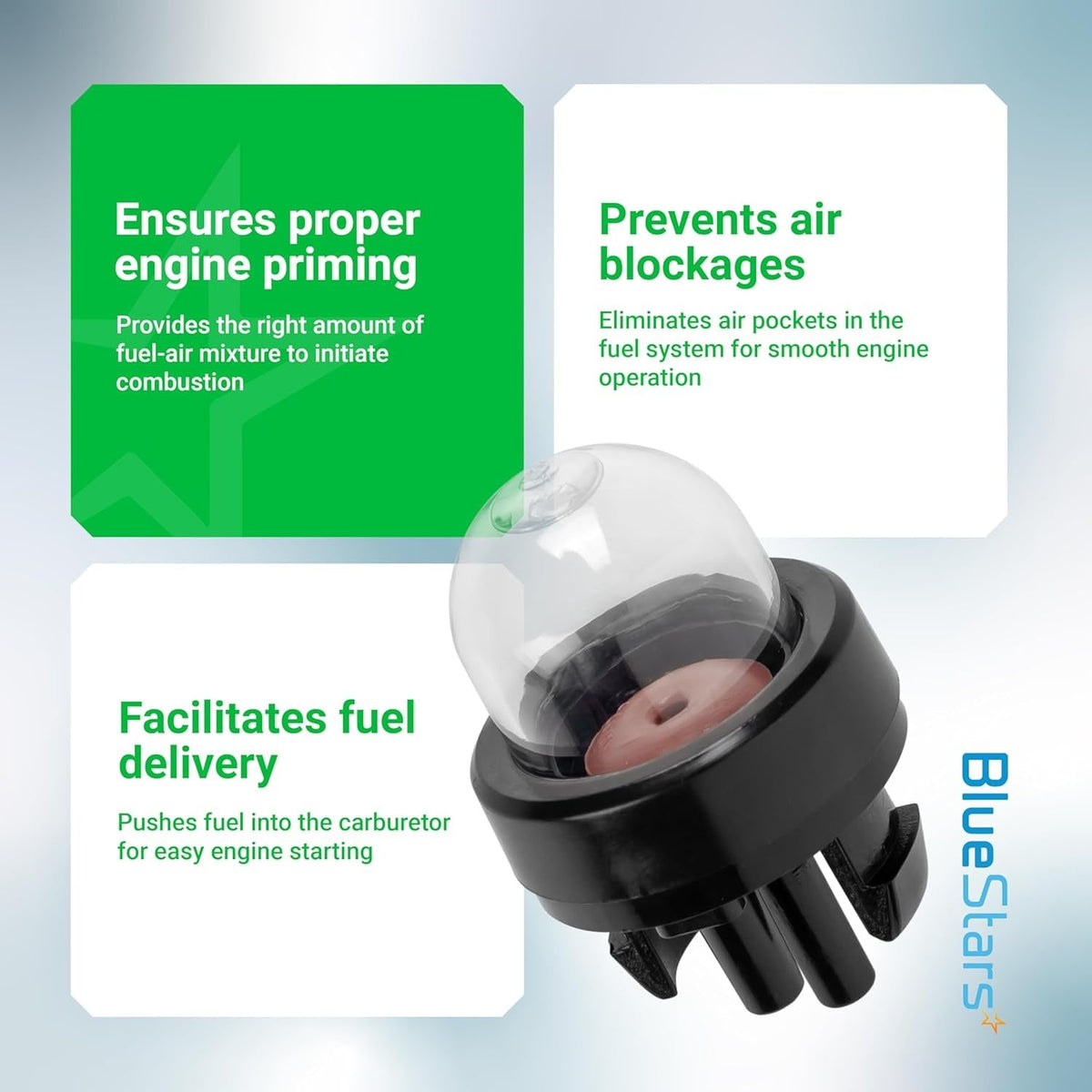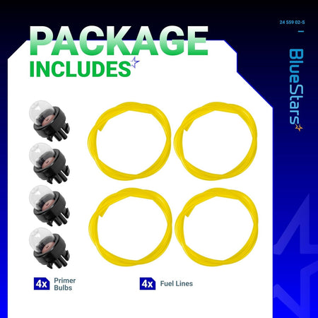 - Package includes 4 primer bulb assemblies and 2 fuel lines.