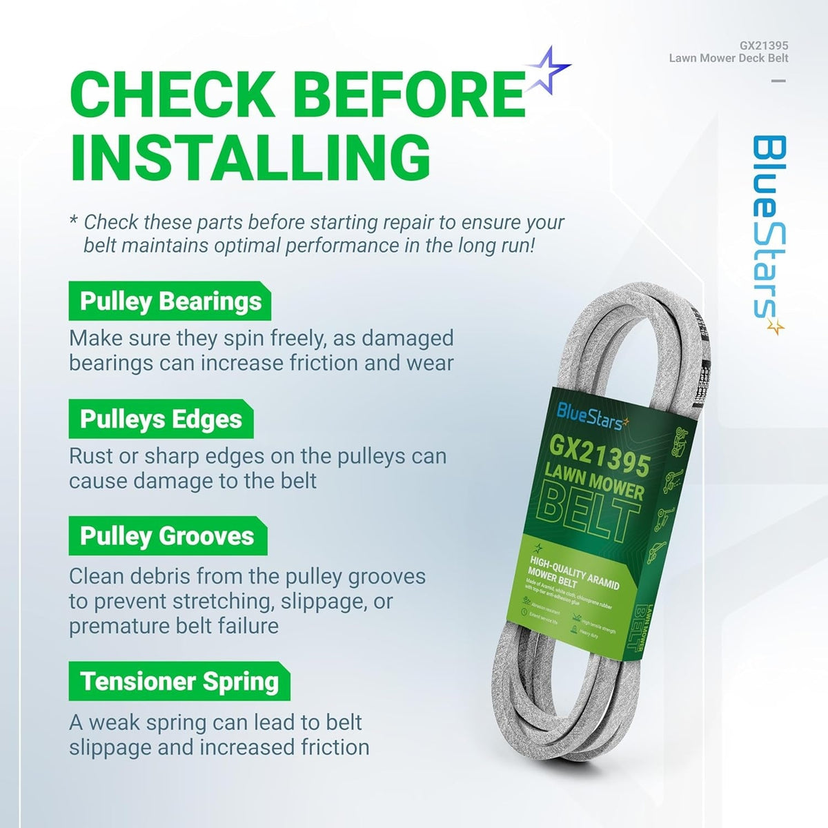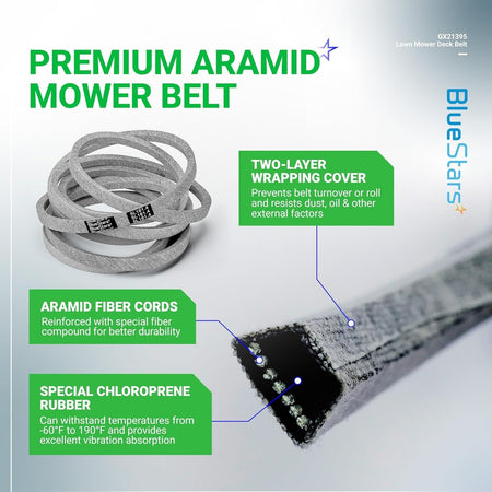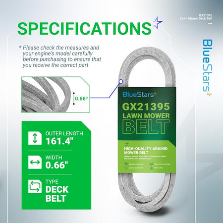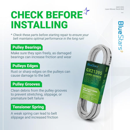 - Power Transmission: The GX21395 belt effectively transfers power from the engine to the blades, ensuring consistent and efficient cutting performance. Look for signs of wear such as cracks, side wall damage, or glazing to determine if replacement is necessary.