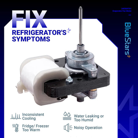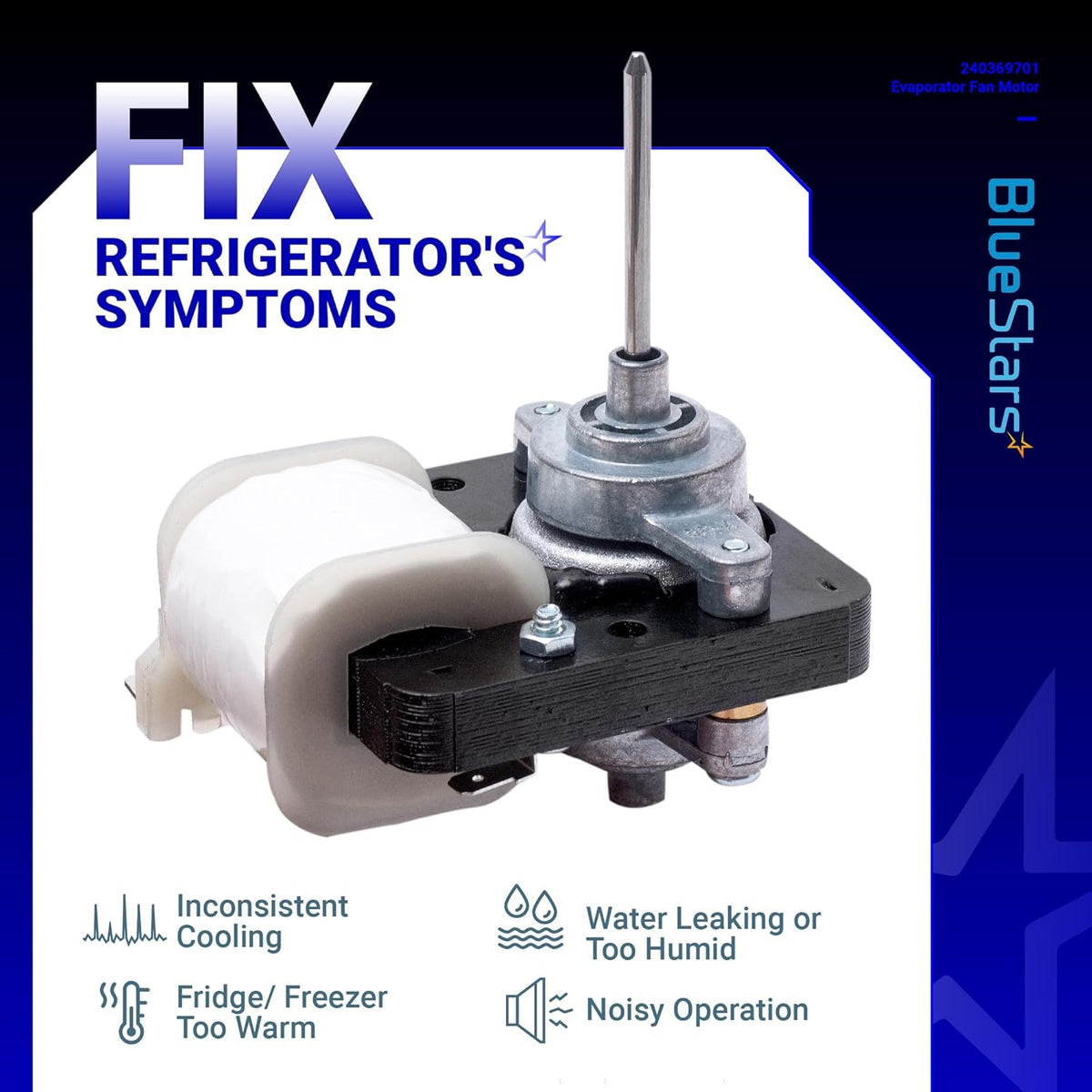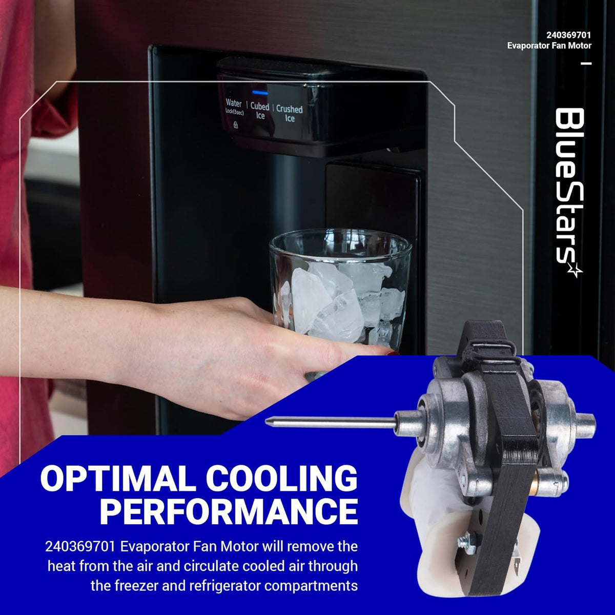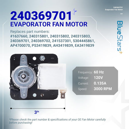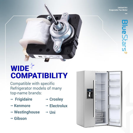 This listing is for a genuine replacement part, the 240369701 Refrigerator Evaporator Fan Motor, compatible with various Frigidaire, Kenmore, and Electrolux refrigerators. This crucial component ensures proper airflow within your refrigerator's freezer compartment, preventing frost buildup and maintaining optimal cooling temperatures.