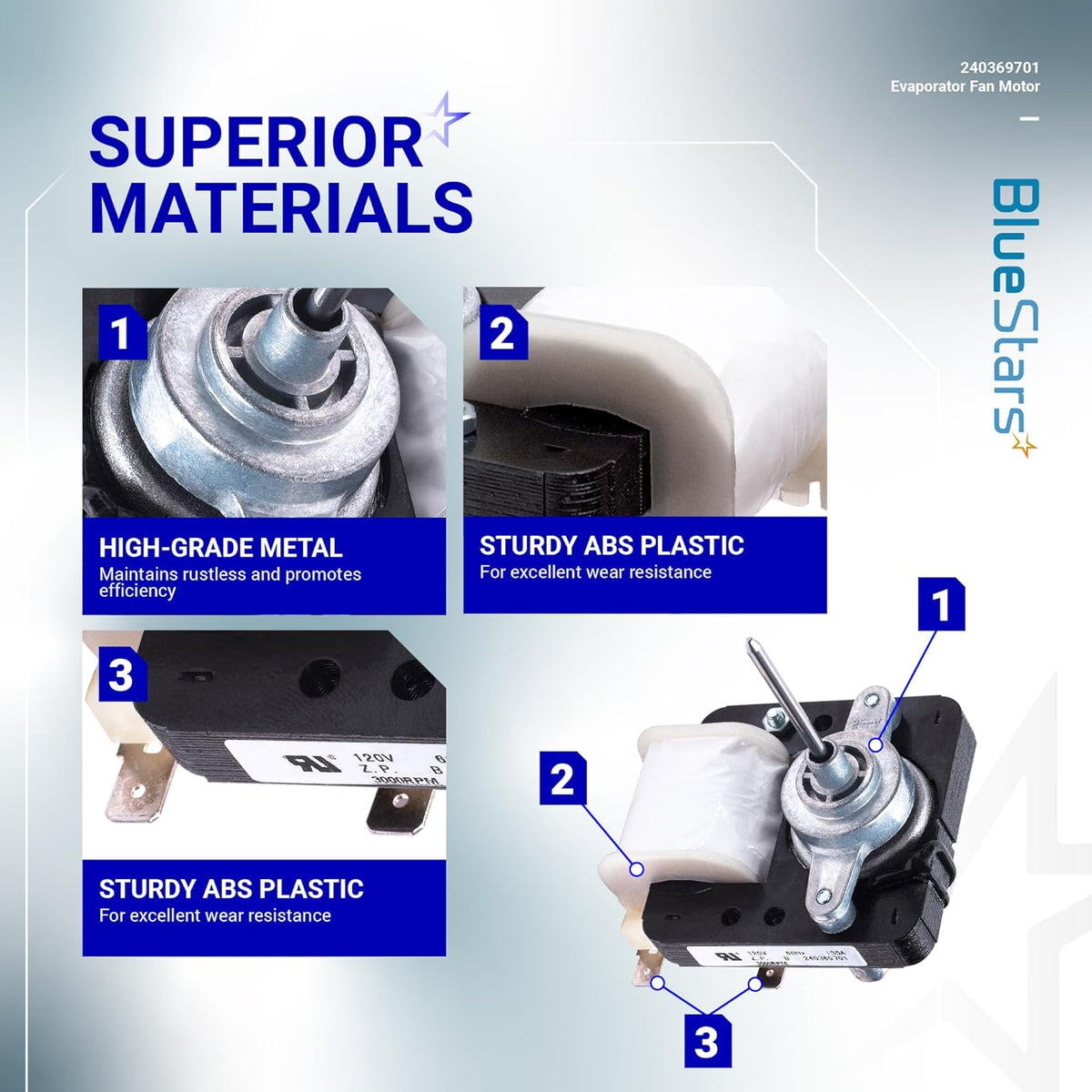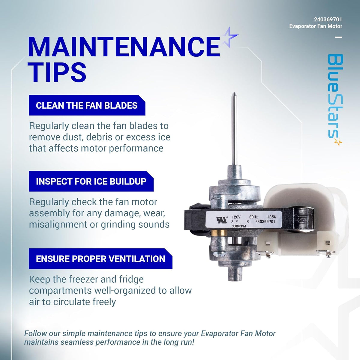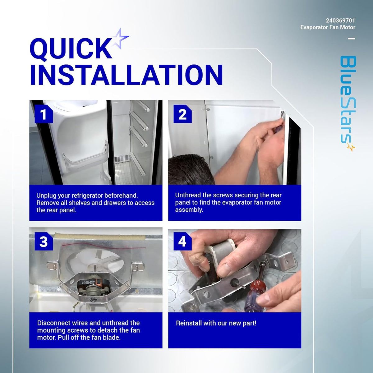 This listing is for a genuine replacement part, the 240369701 Refrigerator Evaporator Fan Motor, compatible with various Frigidaire, Kenmore, and Electrolux refrigerators. This crucial component ensures proper airflow within your refrigerator's freezer compartment, preventing frost buildup and maintaining optimal cooling temperatures.