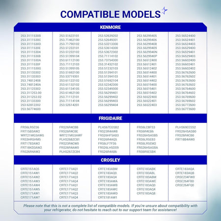 - Compatible with Frigidaire, Kenmore, and Electrolux refrigerators