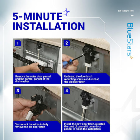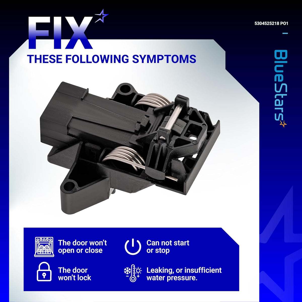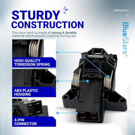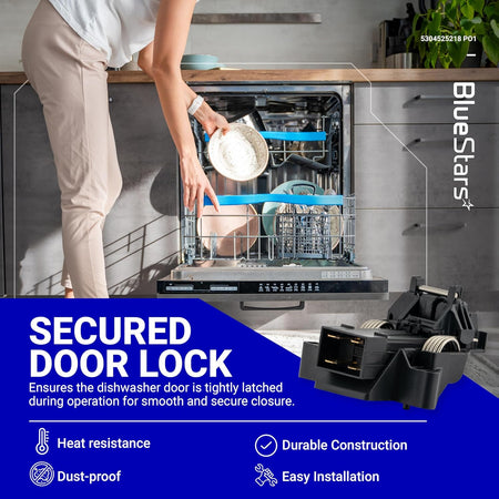 The 5304525218 door lock assembly is made from high-quality, heat- and wear-resistant materials, ensuring durability. Installation is easy; remember to unplug the dishwasher before starting. Wearing work gloves is recommended for hand