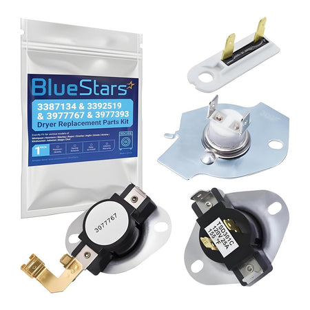 The 3387134 Cycling Thermostat, 3392519 Dryer Thermal Fuse, 3977393 Thermal Cut-off Switch, and 3977767 High-limit Thermostat Kit are designed to fit Whirlpool, Kenmore, and Maytag dryers. This comprehensive kit ensures your appliance operates efficiently and reliably.