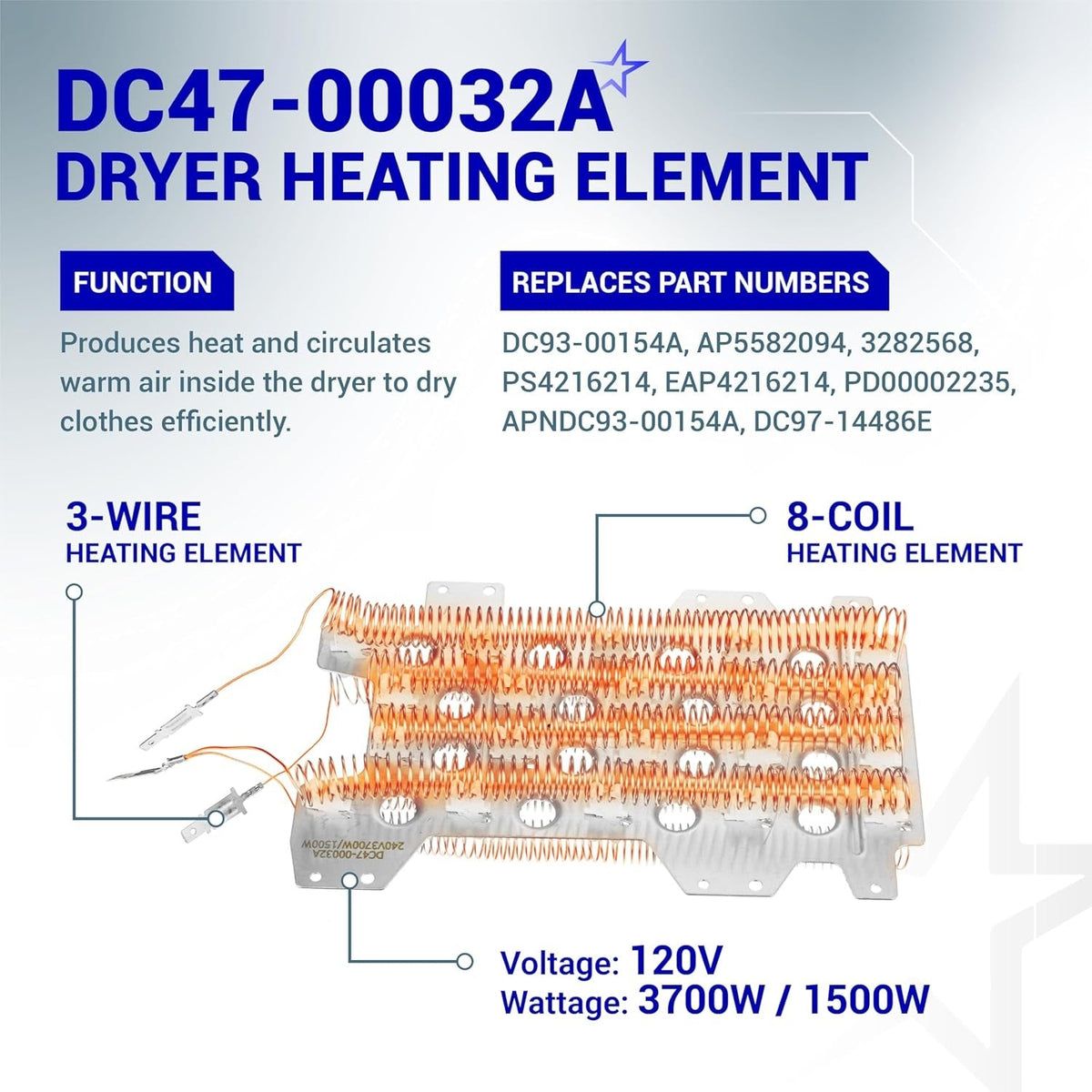 - DC47-00032A Heating Element replaces: #DC93-00154A, AP5582094, 3282568, PS4216214, EAP4216214, PD00002235, APNDC93-00154A, DC97-14486E