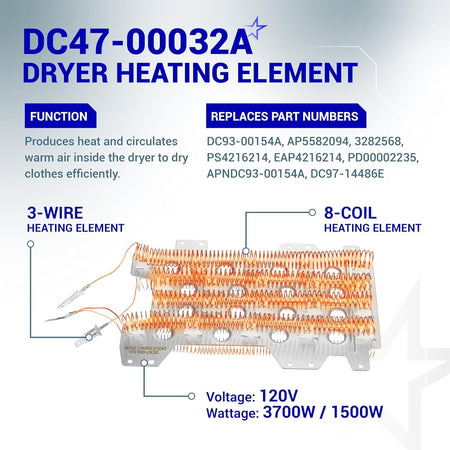 - 1 x DC47-00032A Dryer Heating Element (120V; 3700W / 1500W)