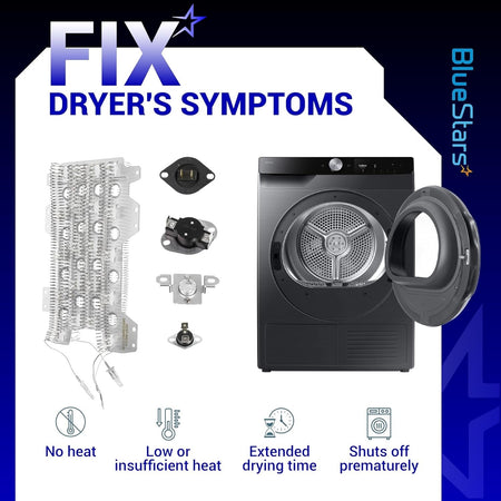 The heating element may fail due to overheating or a short circuit. Before installation, always clean the lint, dust, and debris inside the dryer and vent system to ensure proper airflow. The thermostat or fuse may lose continuity; use a multimeter to test these parts. If continuity is not detected, gently tap to confirm before replacement.