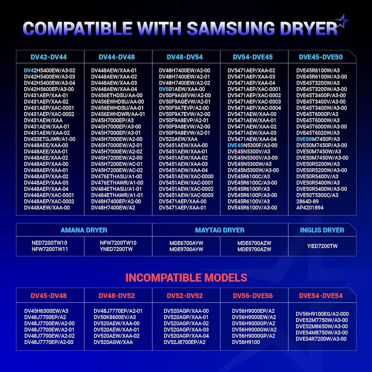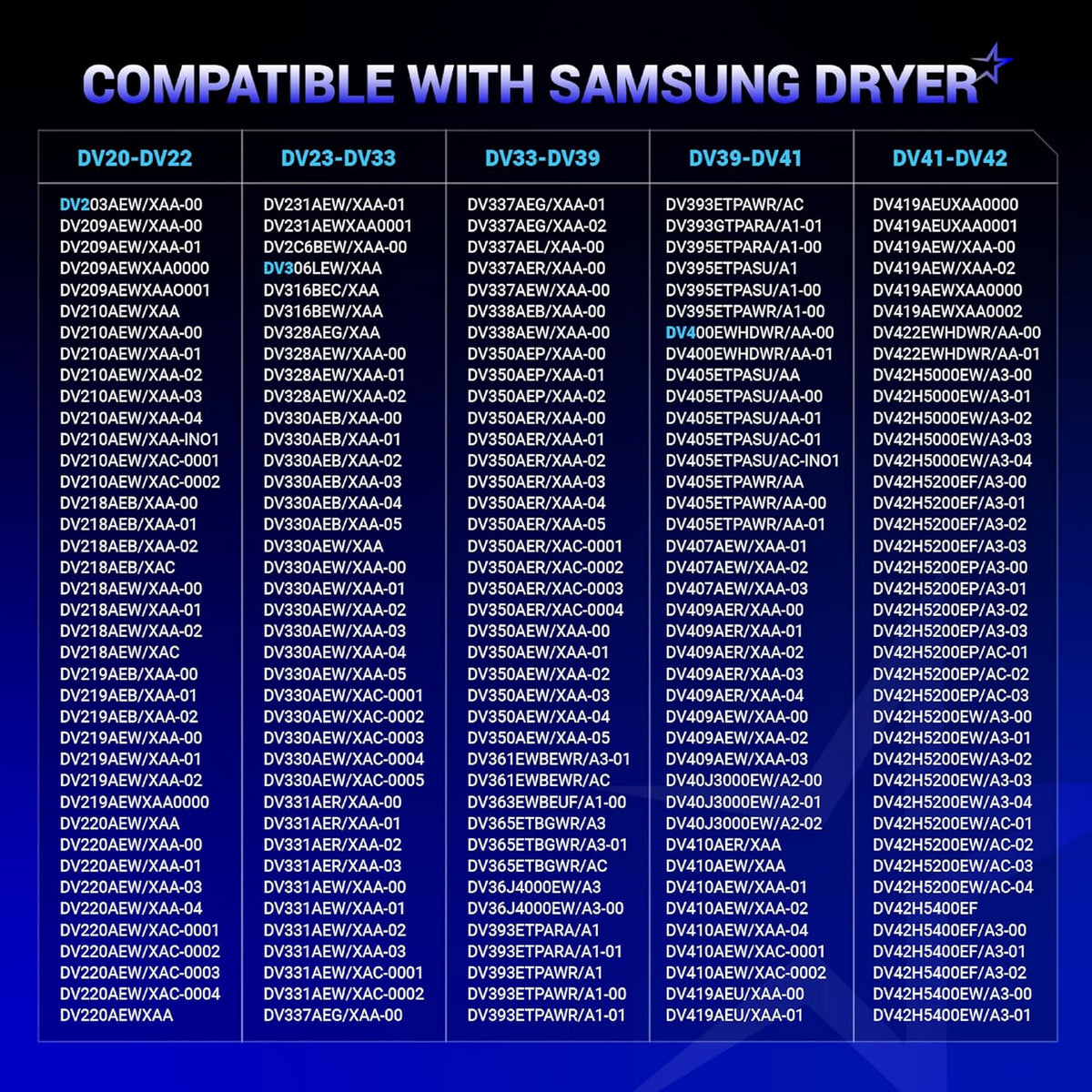 DV45H7200EW/A2-00,DV476ETHASU/A1-00,DV476ETHAWR/A1-00,DV484ETHASU/A1-01,DV484ETHAWR/A1-01,DV501AEW/XAA-00,DV50F9A6EVW/A2-00,DV50F9A6EVW/A2-01,DV50F9A8EVP/A2-01,DV50F9A8EVW/A2-00,DV50F9A8EVW/A2-01,DVE45N5300F/A3-00,DVE45N5300V/A3-00,DVE45N5300W/A3-00,DVE50M7450W/A3-00,DV42H5200EW/A3-01,DV42H5200EW/A3-02,DV42H5200EW/A3-03,DV42H5200EW/A3-04,DV42H5200EW/AC-01,DV42H5200EW/AC-02,DV42H5200EW/AC-03,DV42H5200EW/AC-04,DV42H5000EW/A3-04