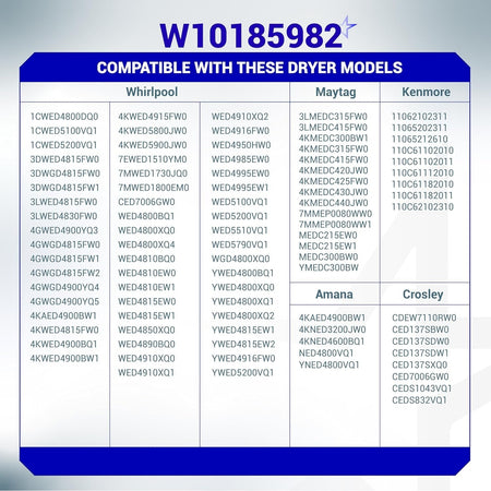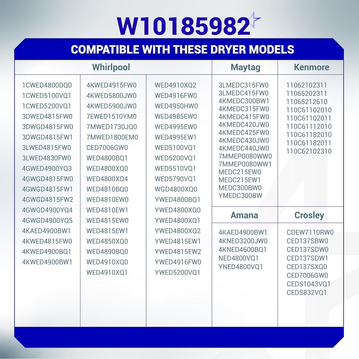 The W10185982 Dryer Timer is compatible with a wide range of dryer models: