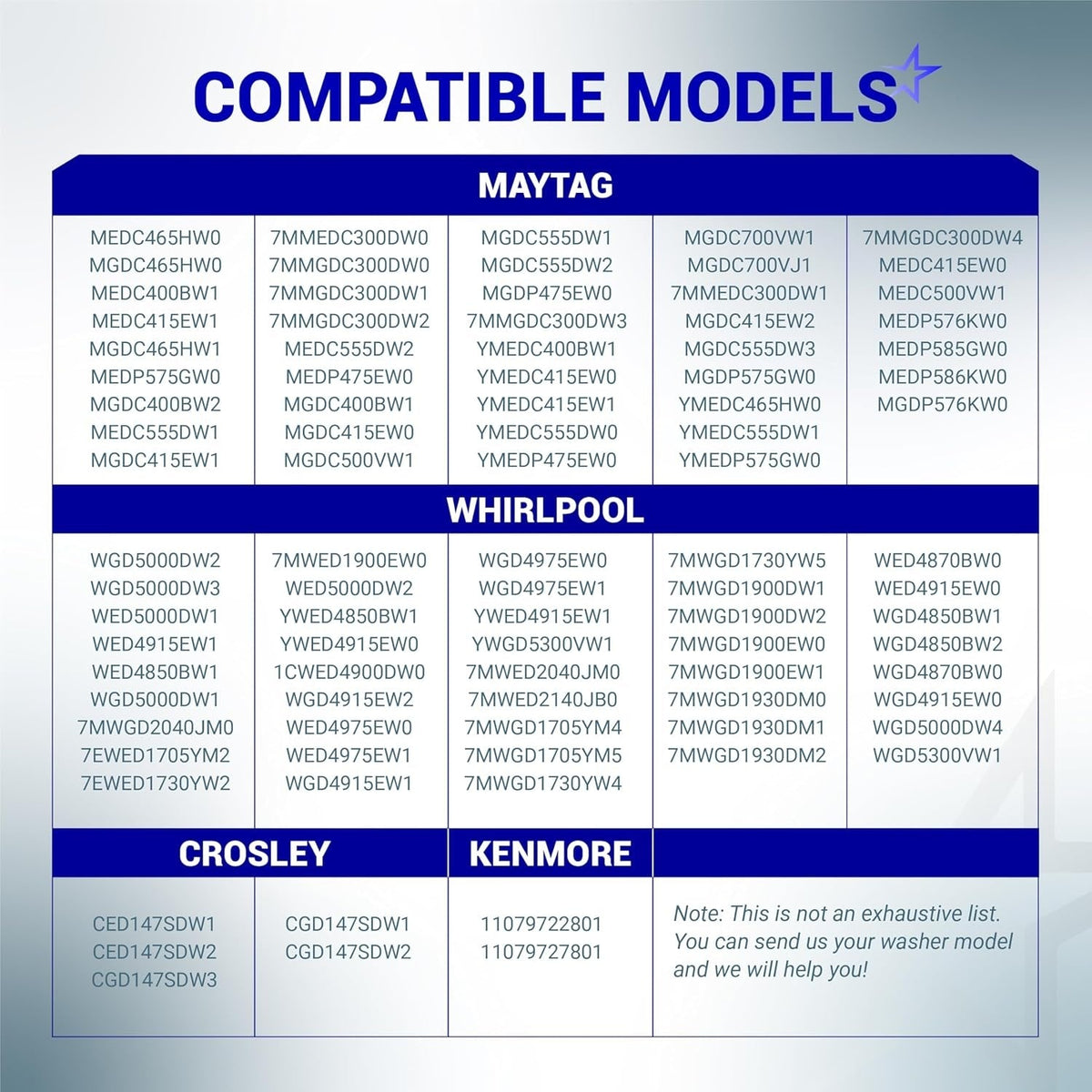 - Whirlpool: WGD5000DW2, WGD5000DW3, WED5000DW1, WED4915EW1, WED4850BW1, WGD5000DW1, 7MWGD2040JM0