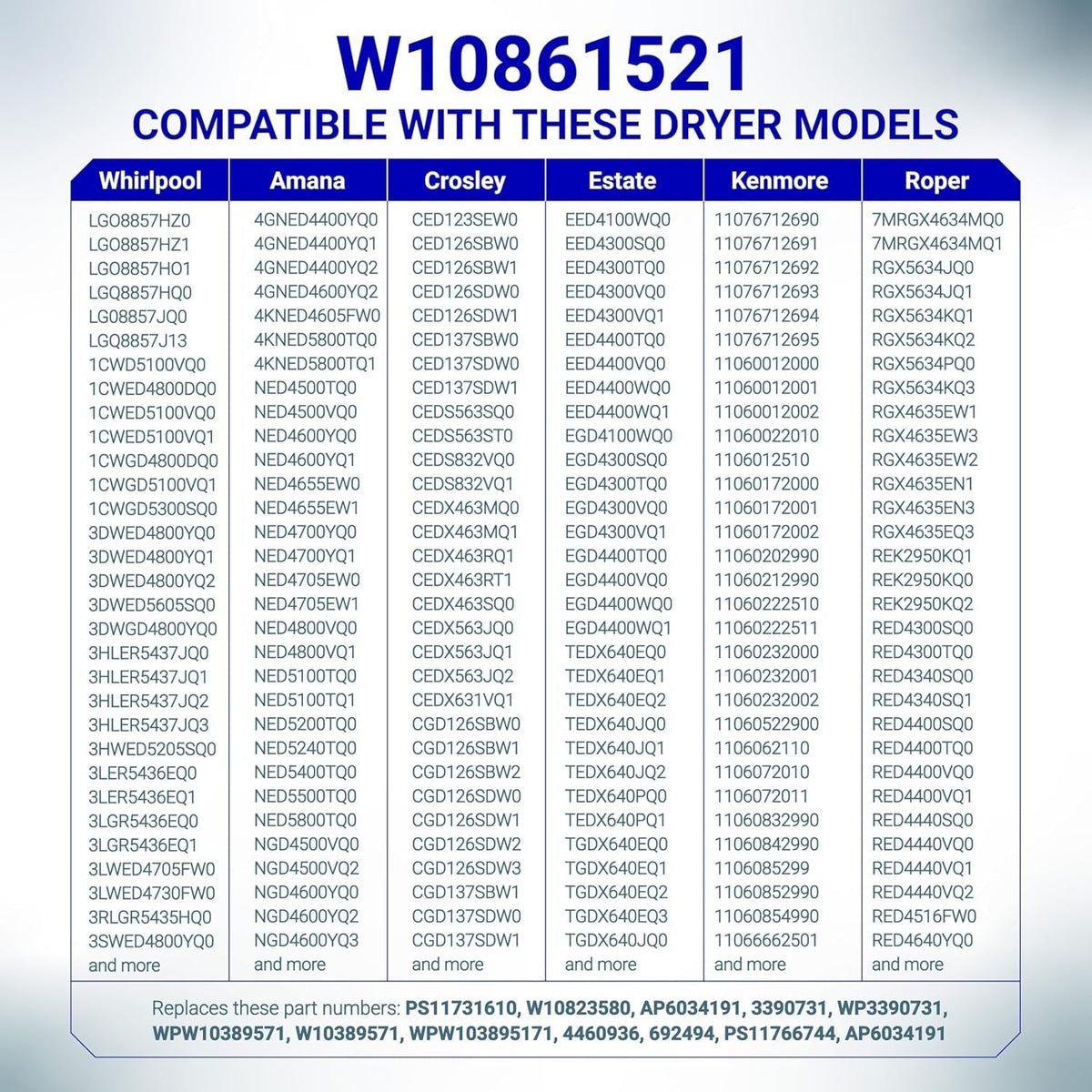 - Wide Compatibility: Replaces part numbers #PS11731610, W10730752, 438201, AP5999407, WP3405246, and is compatible with various dryer models.