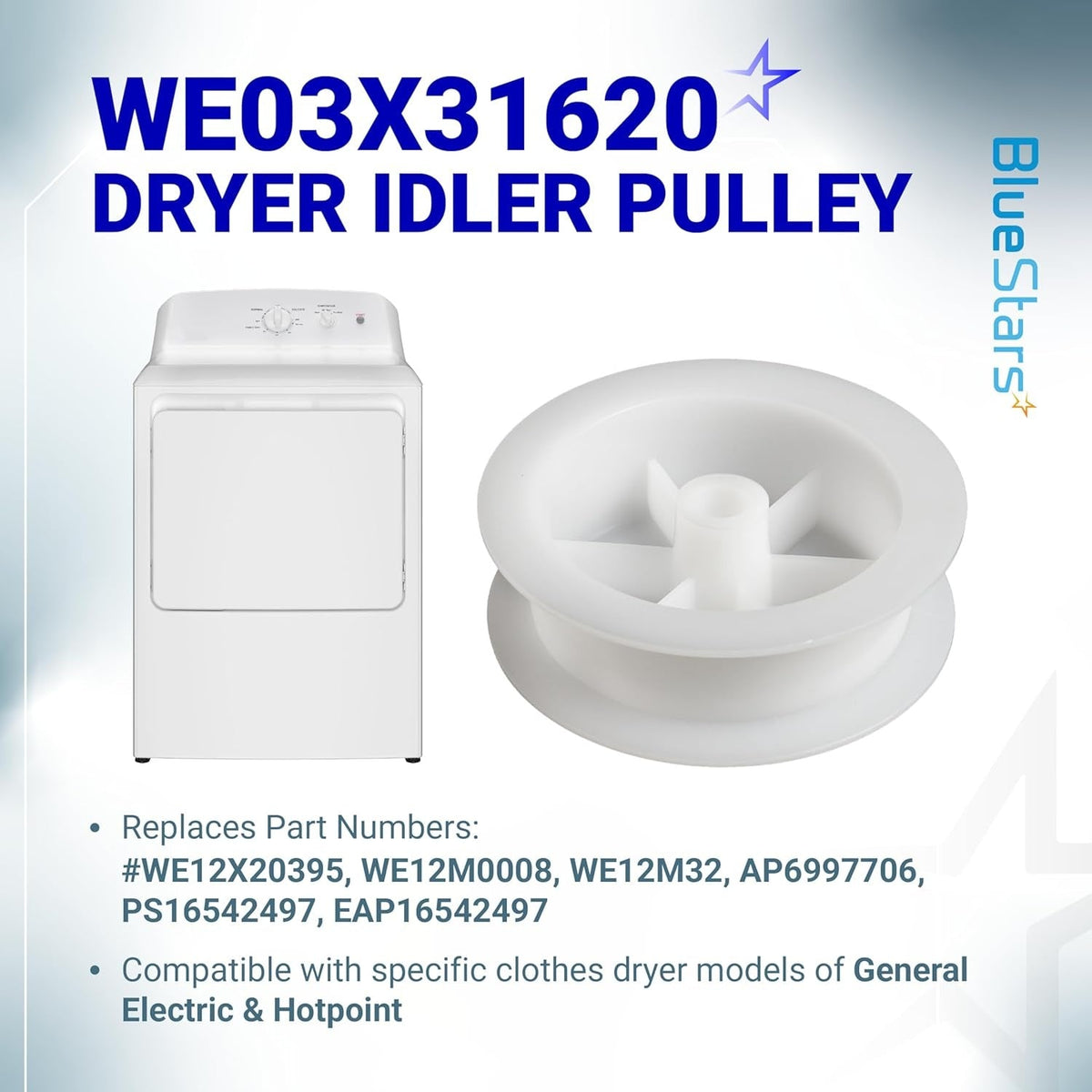 This Dryer Idler Pulley replaces part numbers: #WE03X31620, WE12X20395, WE12M0008, WE12M32, AP6997706, PS16542497, EAP16542497. It is compatible with specific General Electric & Hotpoint clothes dryer models, including: