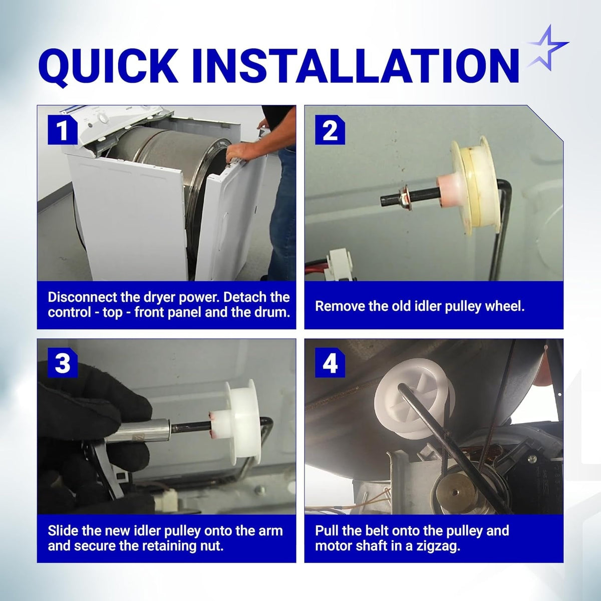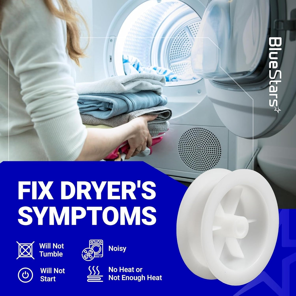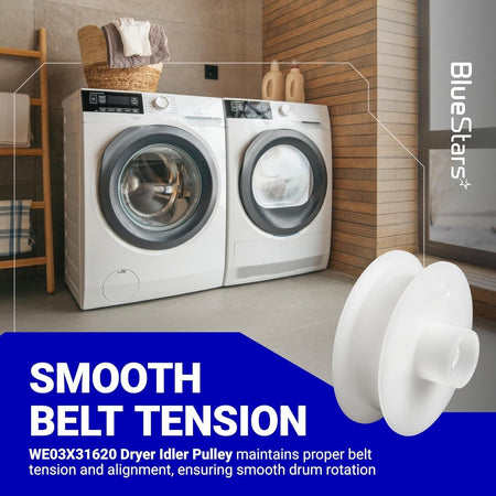 The WE03X31620 Dryer Idler Pulley is designed to lock onto the idler arm, maintaining proper dryer belt tension and alignment. This ensures smooth belt roll and drum rotation for efficient drying with reduced vibration and noise. Over time, a worn pulley can cause issues such as:
