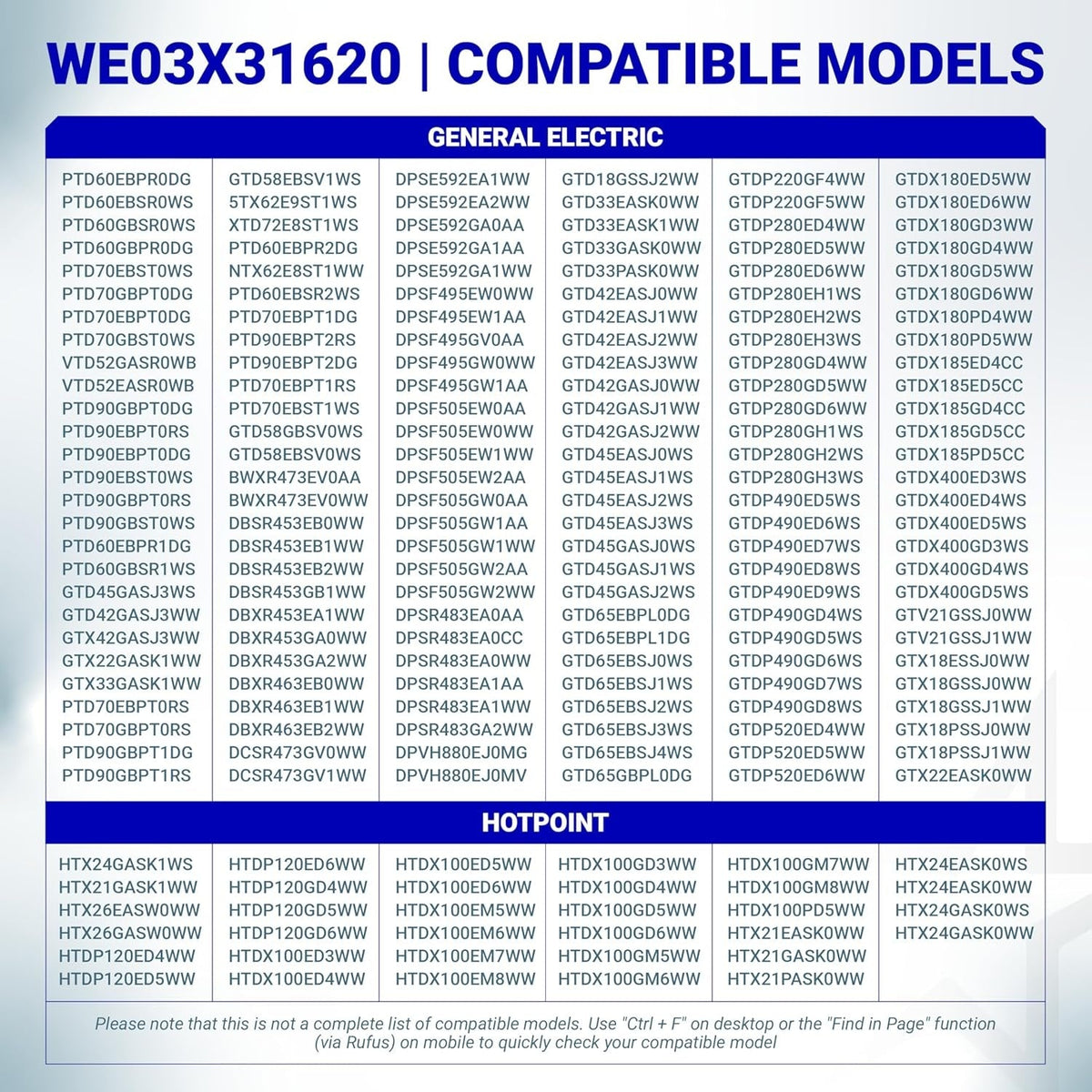 - Hotpoint: HTX24GASK1WS, HTX21GASK1WW, HTX26GASW0WW, HTDP120ED4WW, HTDP120ED5WW, HTDP120GD4WW, HTDX100ED3WW, HTDX100ED6WW, HTDX100EM5WW, HTDX100EM8WW, HTDX100GD3WW, HTDX100GD6WW, HTDX100GM5WW, HTDX100GM8WW, HTDX100PD5WW, HTX21EASK0WW, HTX21GASK0WW, HTX24EASK0WS, HTX24GASK0WW, NBXR453EV1WW, etc.