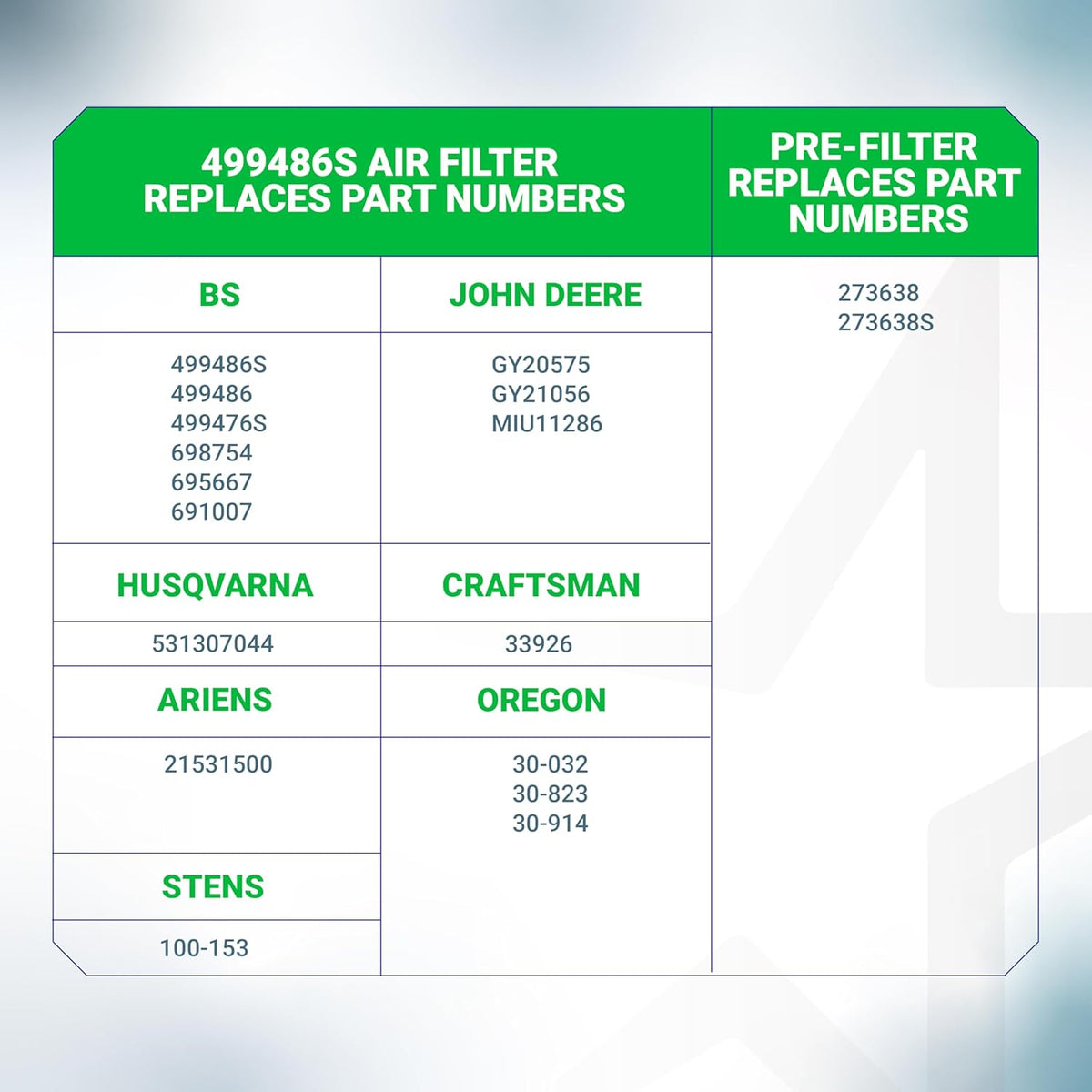 - Pre-Filter Replaces: Briggs & Stratton 273638, 273638S