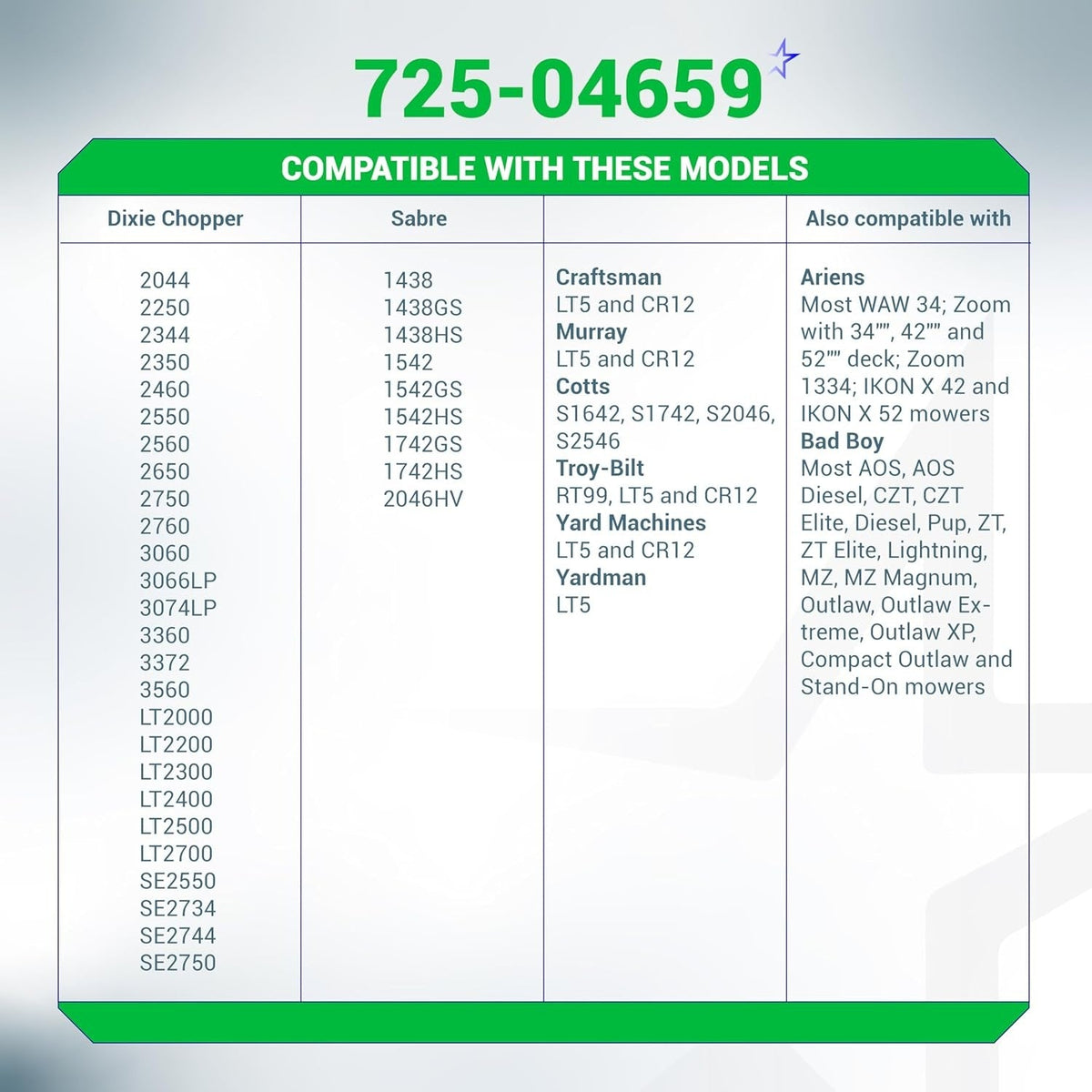 - Compatible with equipment from manufacturers including MTD, Cub Cadet, Troy-Bilt, Craftsman, Murray, Ariens, Gravely, Bad Boy, Dixie Chopper, and John Deere.