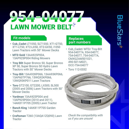 - MTD / Cub Cadet / Troy-Bilt: 754-04077, 954-04077, 954-04077A