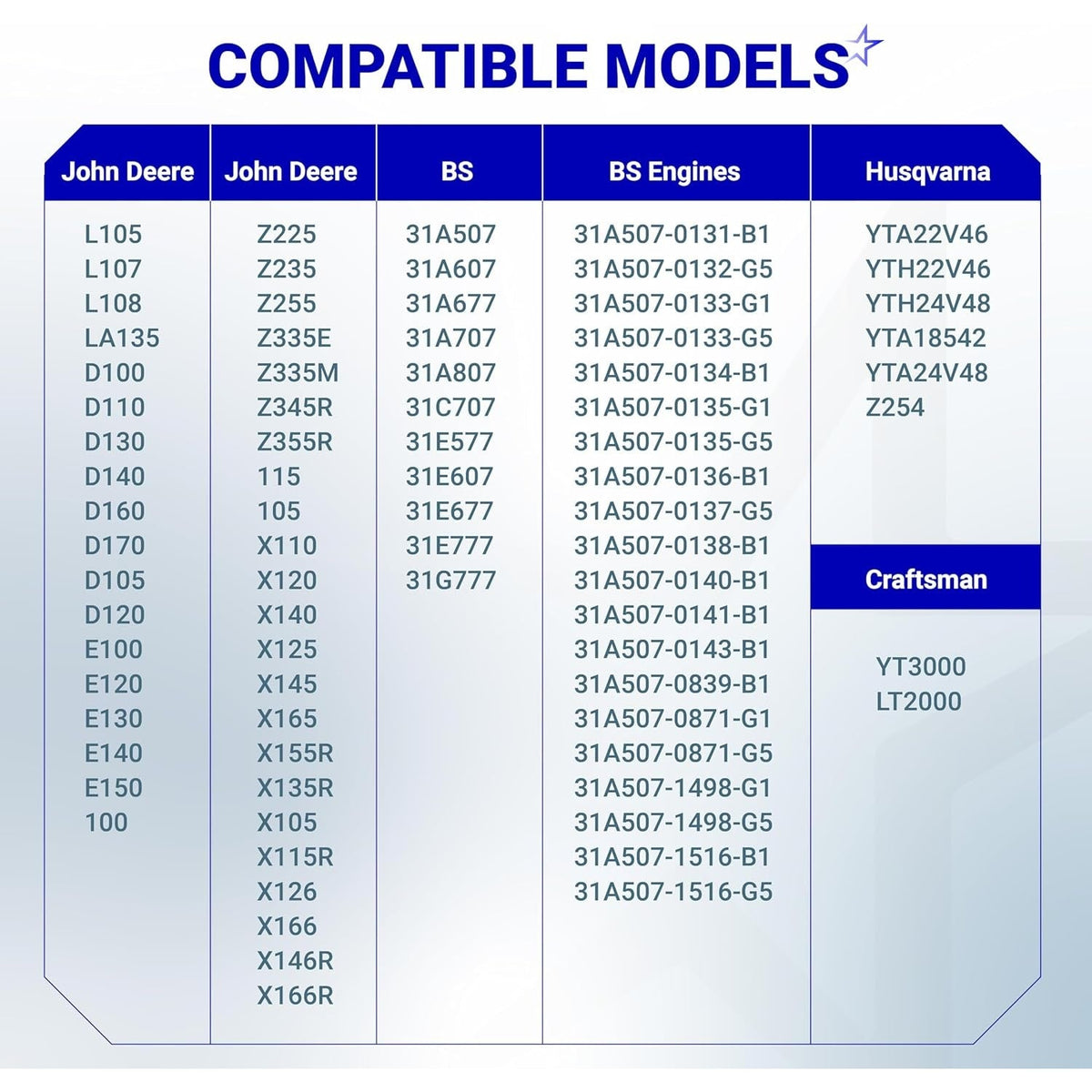 • Fits John Deere Models: D100, D105, D110, D120, D125, D130, D140, E100, E120, E130, E140
