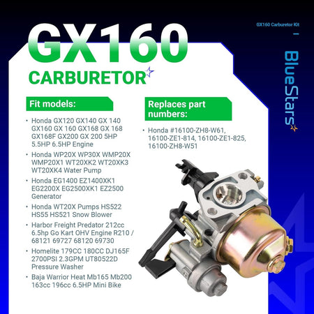 This complete carburetor assembly is designed as a direct replacement for Honda GX120, GX140, GX160, GX168, and GX200 engines. It is compatible with 5HP, 5.5HP, and 6.5HP models, making it an ideal choice for your engine repair needs.