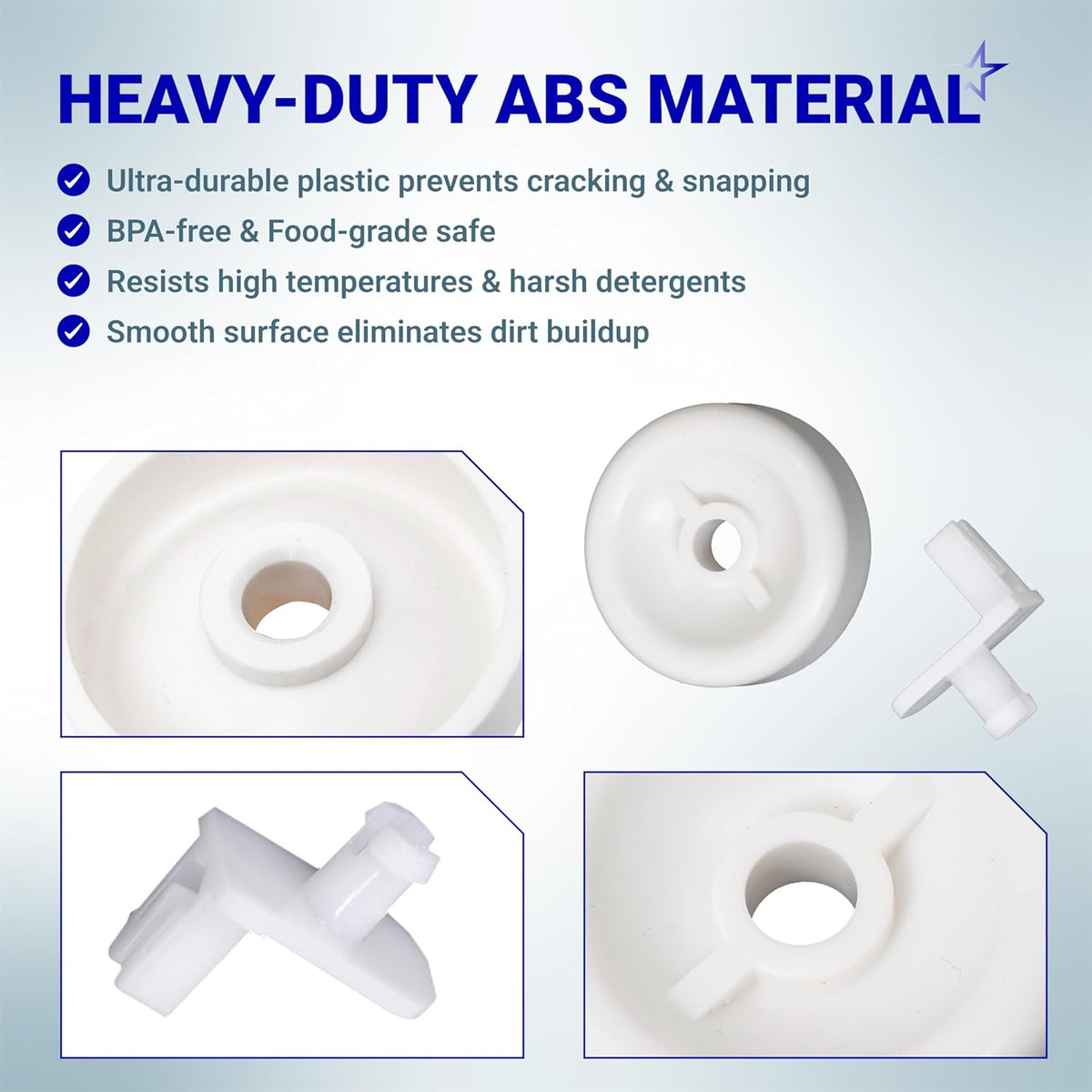 - Enhanced Axle Strength: Features a reinforced mounting stud (axle) that prevents the wheel from wobbling or popping off under the weight of heavy dish loads.