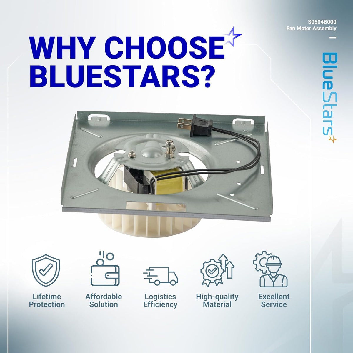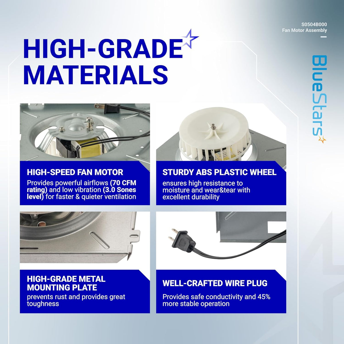 The S0504B000 Fan Motor Assembly features a robust design with a high-speed motor that delivers powerful airflow (70 CFM rating) while minimizing vibration and noise (3.0 Sones level). The ABS plastic fan wheel is moisture-resistant and durable, complemented by a high-grade metal mounting plate that prevents rust. A well-crafted wire plug ensures safe conductivity and 45% more stable operation.