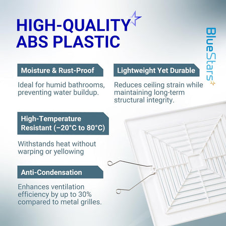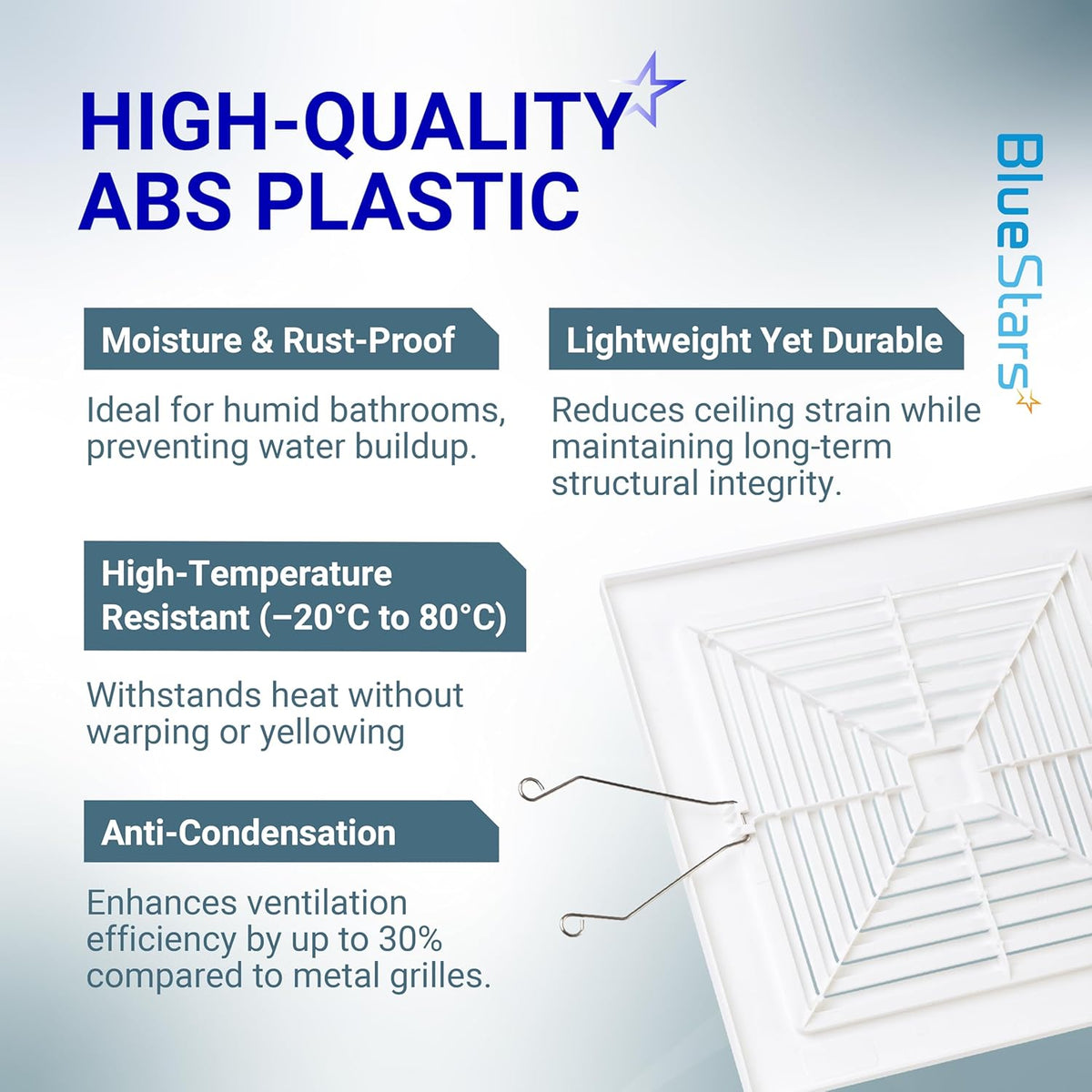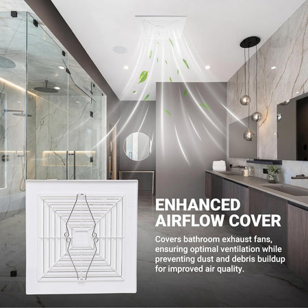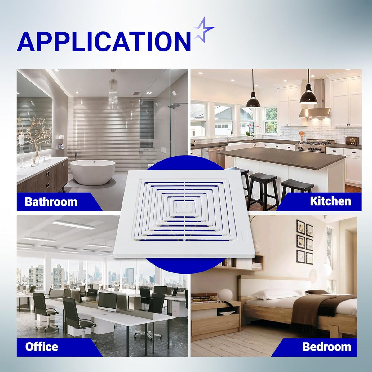 This white square ceiling or wall-mount exhaust fan plastic grille cover is ideal for bathroom fans, ventilation fans, and home ventilation systems. It can also function as an air diffuser or a ceiling air diffuser.
