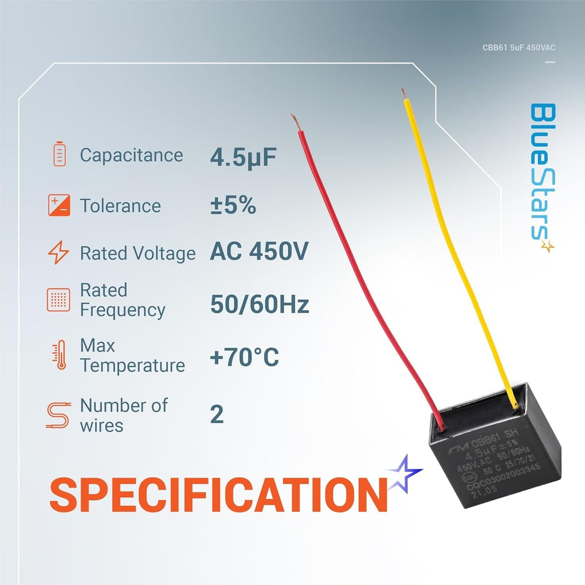 Enhance the performance of your ceiling fan with the CBB61 4.5uF 450V 2-Wire Ceiling Fan Capacitor. This essential component is designed to start and operate single-phase motors in both 50Hz and 60Hz AC electric power systems.