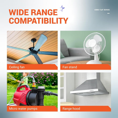 • Versatile Compatibility: Perfectly fits a variety of applications including ceiling fans, wall fans, stand fans, industrial fans, range hood fans, air exchange fans, water pumps, motors, and generators.
