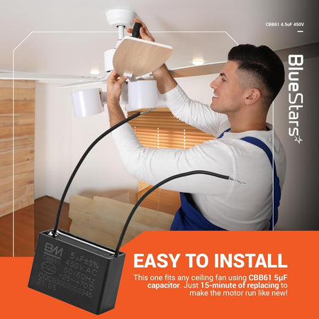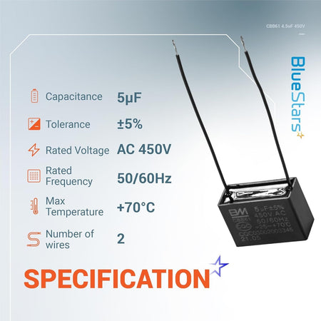 Revitalize your ceiling fan's performance with the CBB61 5uf 2 Wire 450V Ceiling Fan Capacitor. Designed to start and operate single-phase motors in both 50Hz and 60Hz AC electric power systems, this capacitor is essential for restoring your fan's functionality.