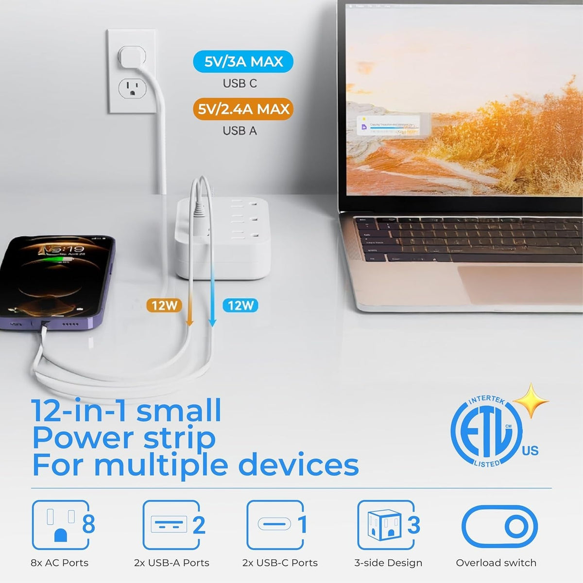 Extension Cord 1Ft 8 Outlets Power Strip Flat Plug Surge Protector with 4 USB