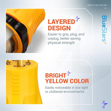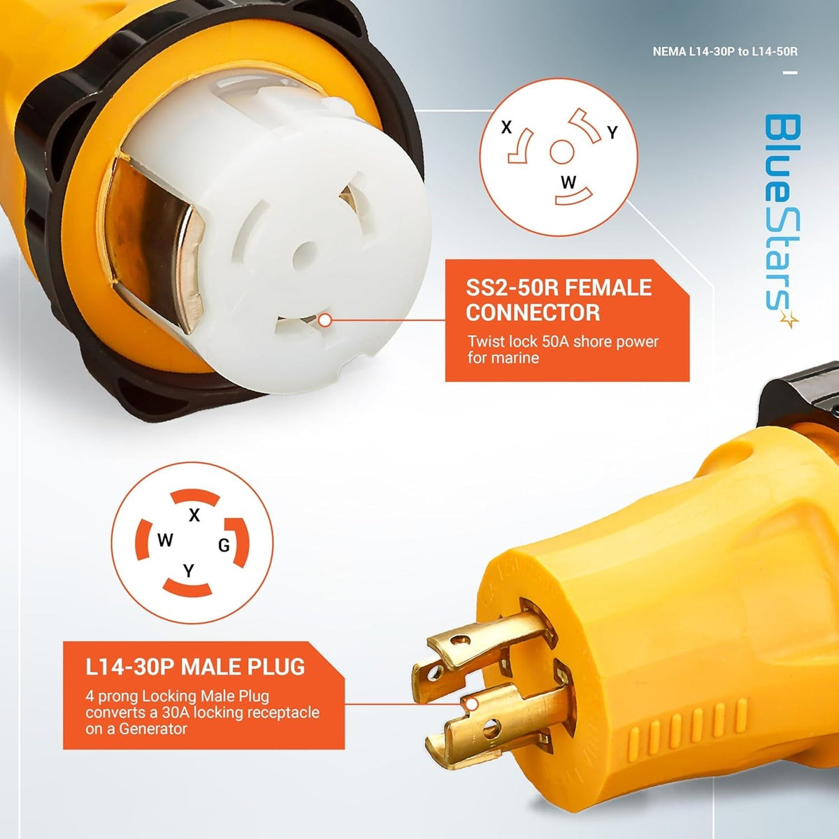 The BlueStar Generator Adapter seamlessly integrates a 30 Amp Male Plug (L14-30P) with a 50 Amp Female Connector (SS2-50R). Its 4-prong twist-lock design guarantees a secure and stable connection, enhancing safety during operation. This adapter is specifically designed to connect a 30 Amp external receptacle at RV parks or campgrounds to an RV's 50A power inlet or your home's 50A power inlet box.