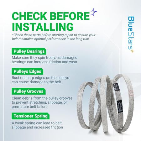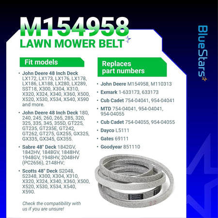Ensure optimal performance and durability with the M154958 Lawn Mower Deck Belt, designed for a variety of compatible models. Please verify measurements and your engine's model before purchasing to ensure you receive the correct parts.