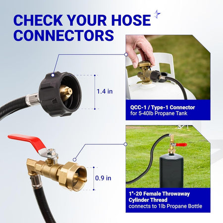 - Inlet: QCC-1 / Type-1 Connector (for 5-40lb Propane Tank)