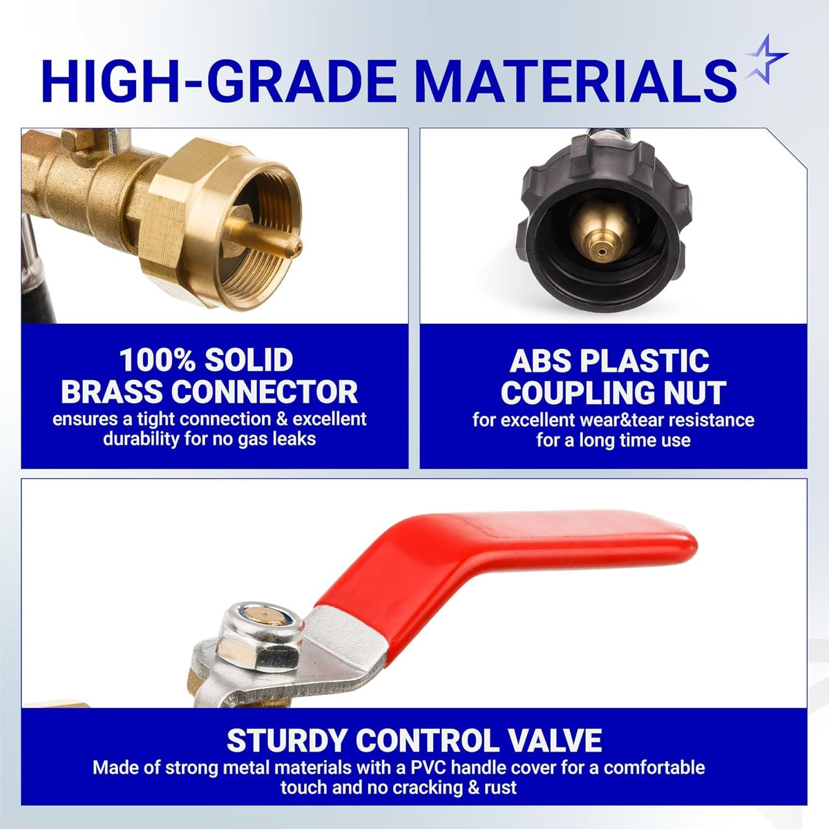 With 100% solid Brass hose connectors, this construction guarantees a tight and secure connection, offering leak-free gas transmission and high corrosion resistance to outdoor cooking environments.