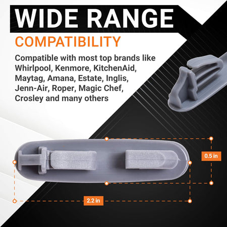 Upgrade your dishwasher's performance with our set of two replacement upper rack slide rail stop clips, compatible with various models from Whirlpool, Kenmore, KitchenAid, and Maytag. These clips are specifically engineered to enhance stability and prevent the upper dish rack from wobbling or sliding off track, ensuring a safer and more efficient dishwashing experience.